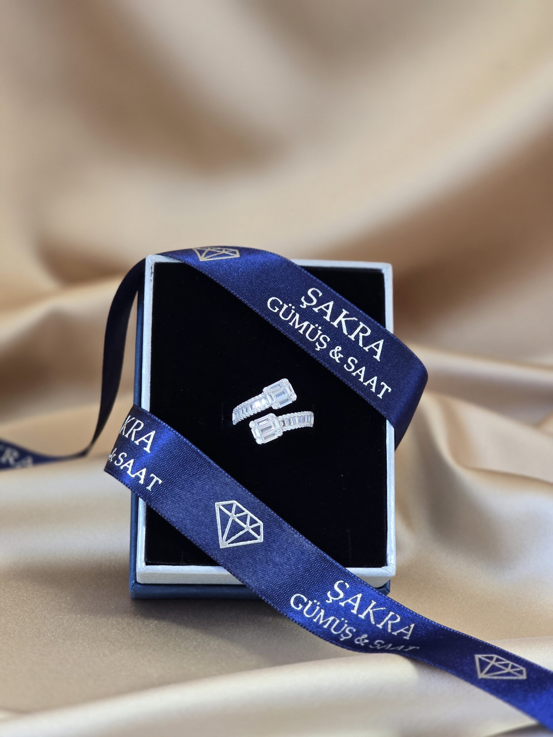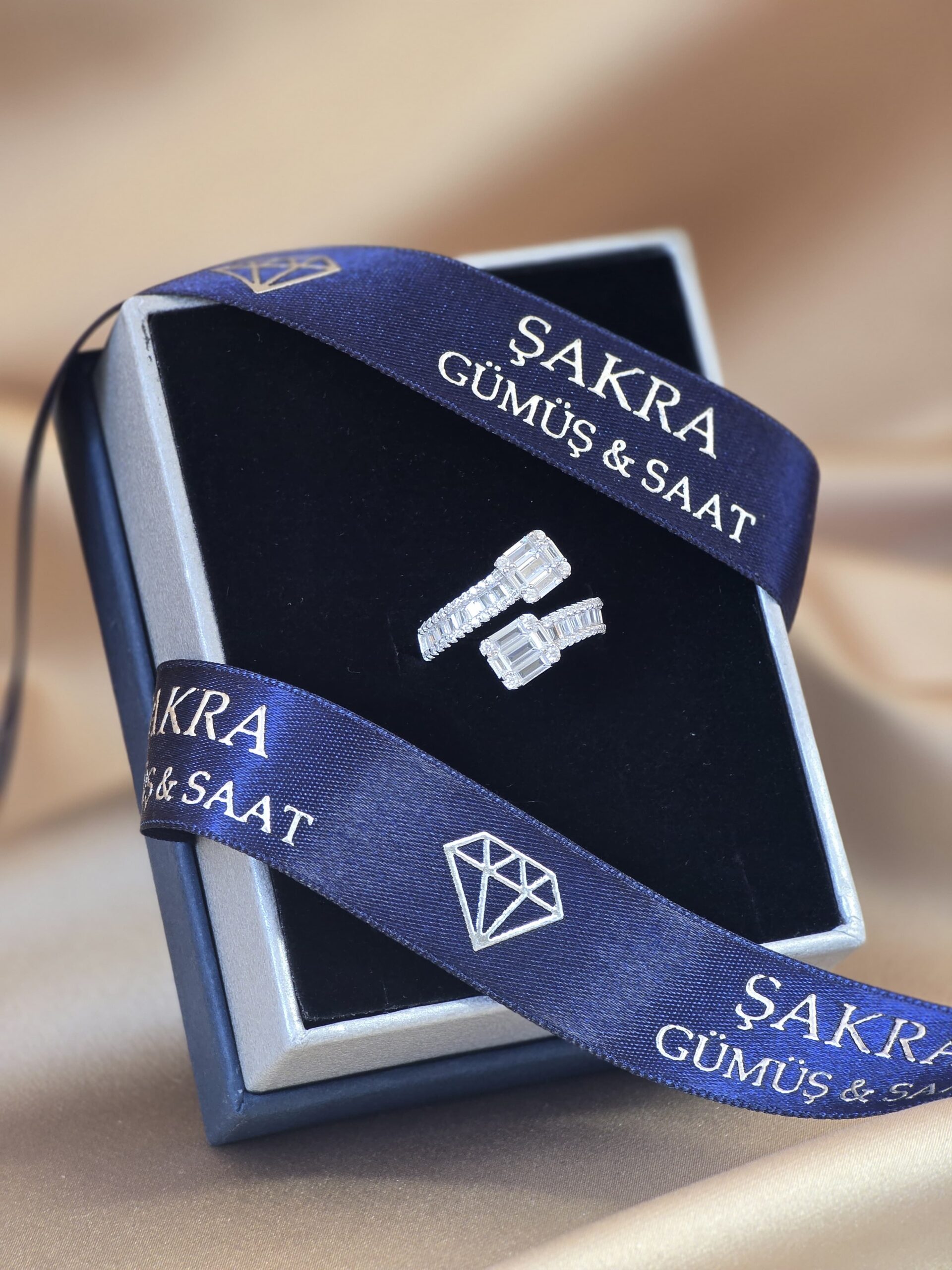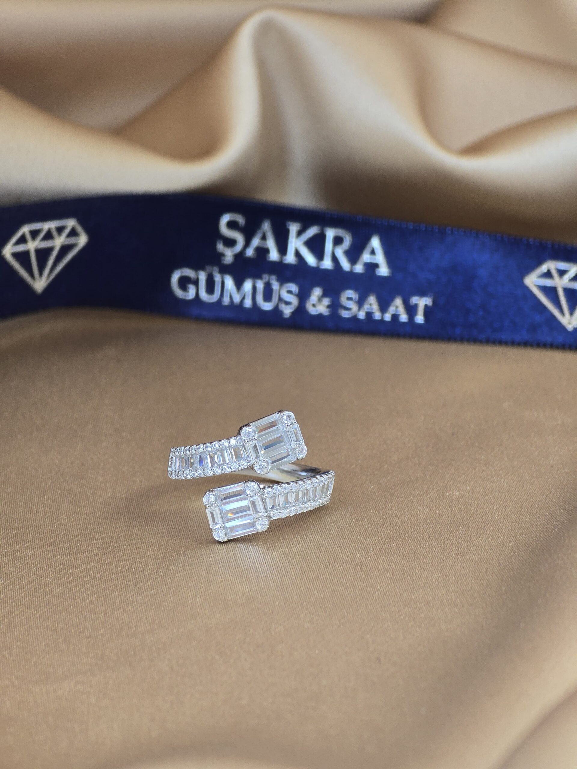 Modern çizgisi ve göz alıcı ışıltısıyla dikkat çeken baget taşlı çift başlı gümüş yüzük, Şakra Gümüş & Saat’in şık ve zarafet dolu modellerinden biridir.