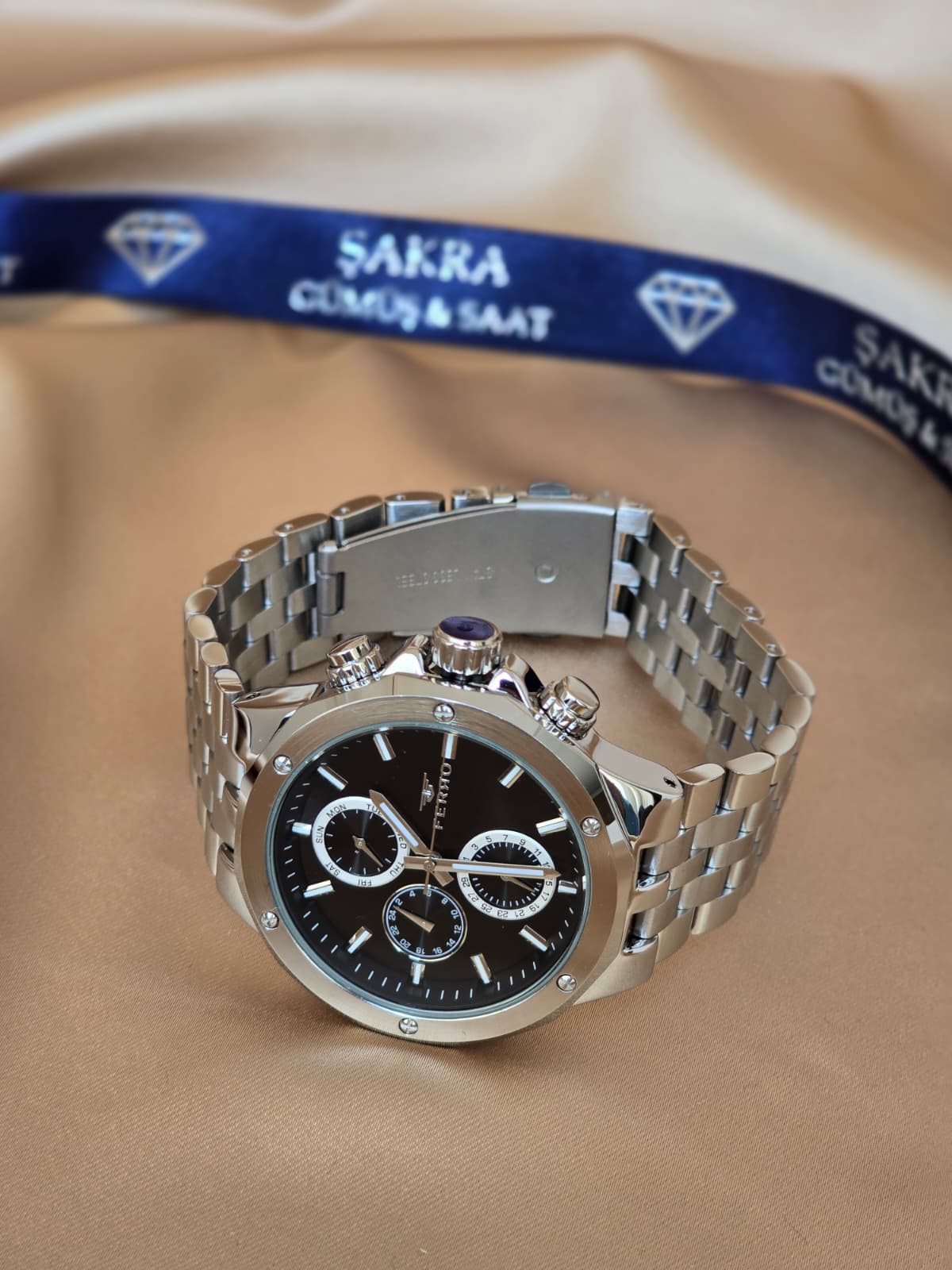 FERRO Black Bolt Multi Function erkek kol saati, vidalı çerçeve detayı ve siyah kadranı ile güçlü ve iddialı bir duruş sergiler. Çok fonksiyonlu kadran yapısı; gün, tarih ve 24 saat göstergeleriyle hem şıklığı hem de işlevselliği bir araya getirir. Çelik kasa ve metal kordonu, sağlamlık ve konfor sunarken; net hatları ve maskülen tasarımıyla spor-şık kombinlerin vazgeçilmez tamamlayıcısıdır. Gücünü detaylarında göstermek isteyen erkekler için tasarlanmıştır.