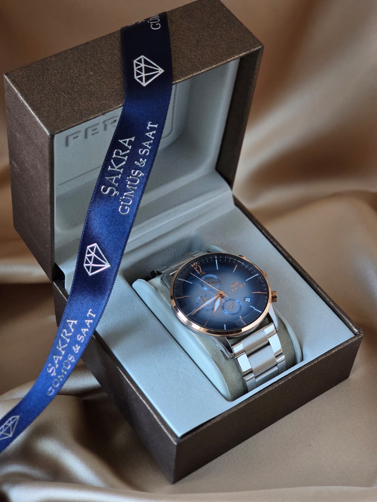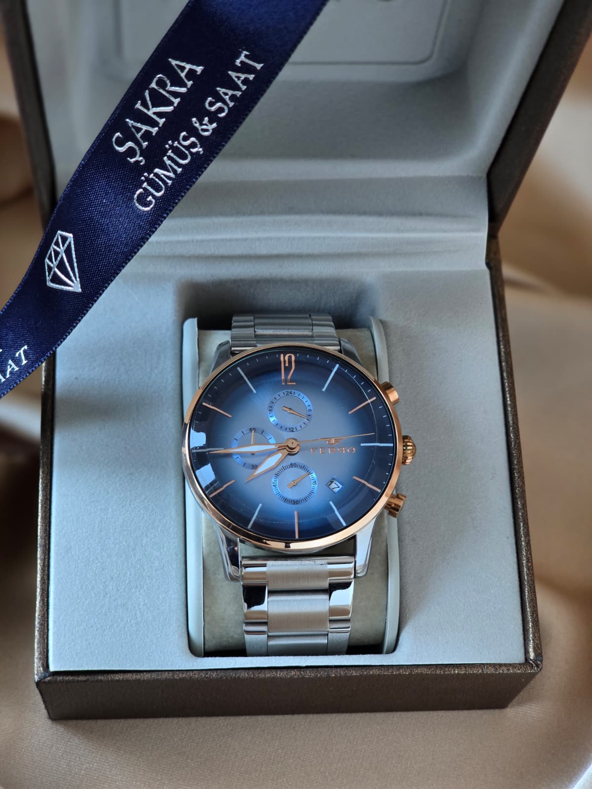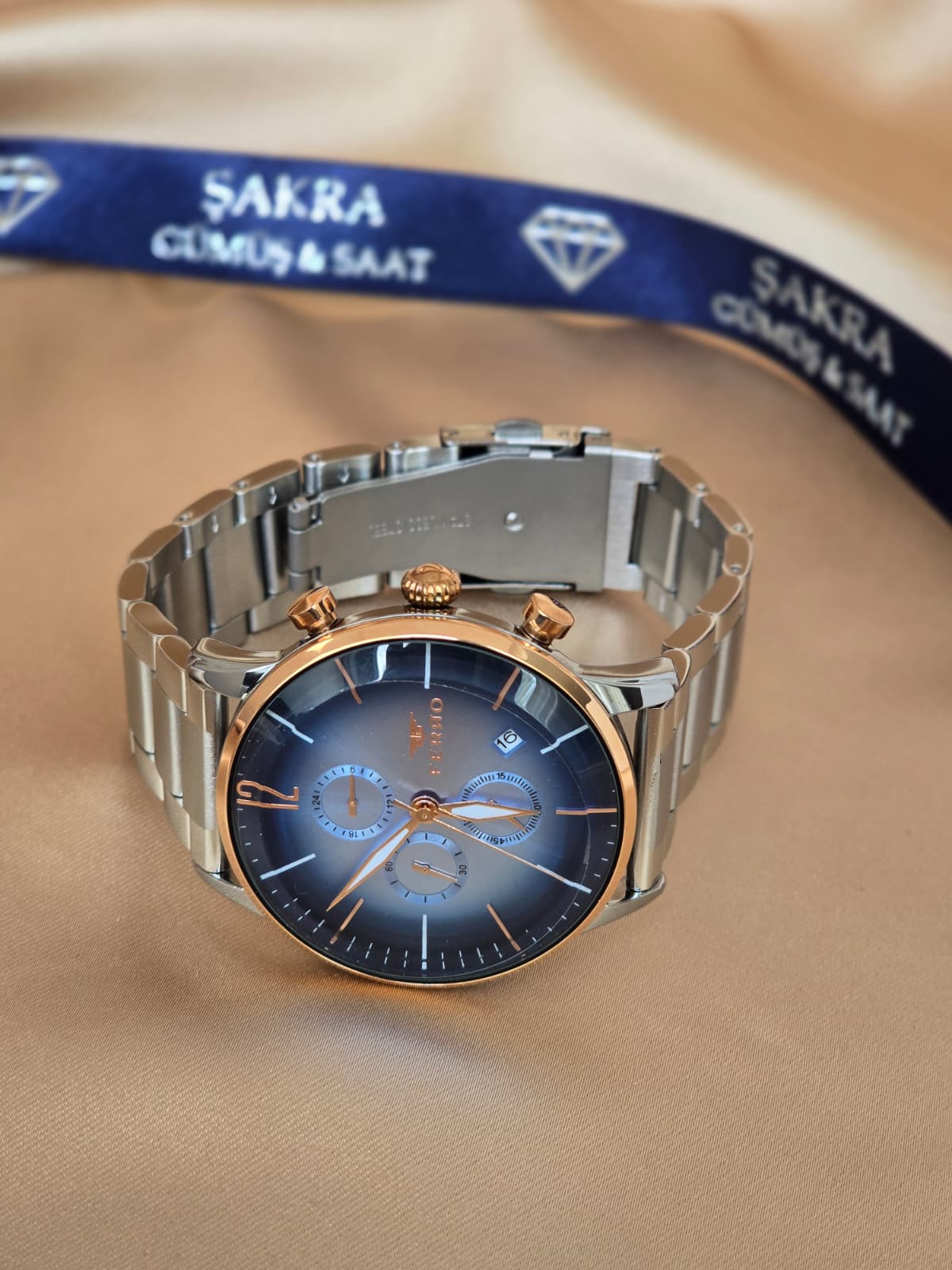 FERRO çelik erkek kol saati, lacivert degrade kadranı ve rose gold detaylarıyla güçlü ve sofistike bir duruş sunar. Çok fonksiyonlu kadran yapısı, saatin teknik karakterini ön plana çıkarırken; parlak kasa ve metal bilezik tasarımı modern şıklığı tamamlar. Günlük kullanımdan özel anlara kadar stilinden ödün vermek istemeyen erkekler için tasarlanmıştır.