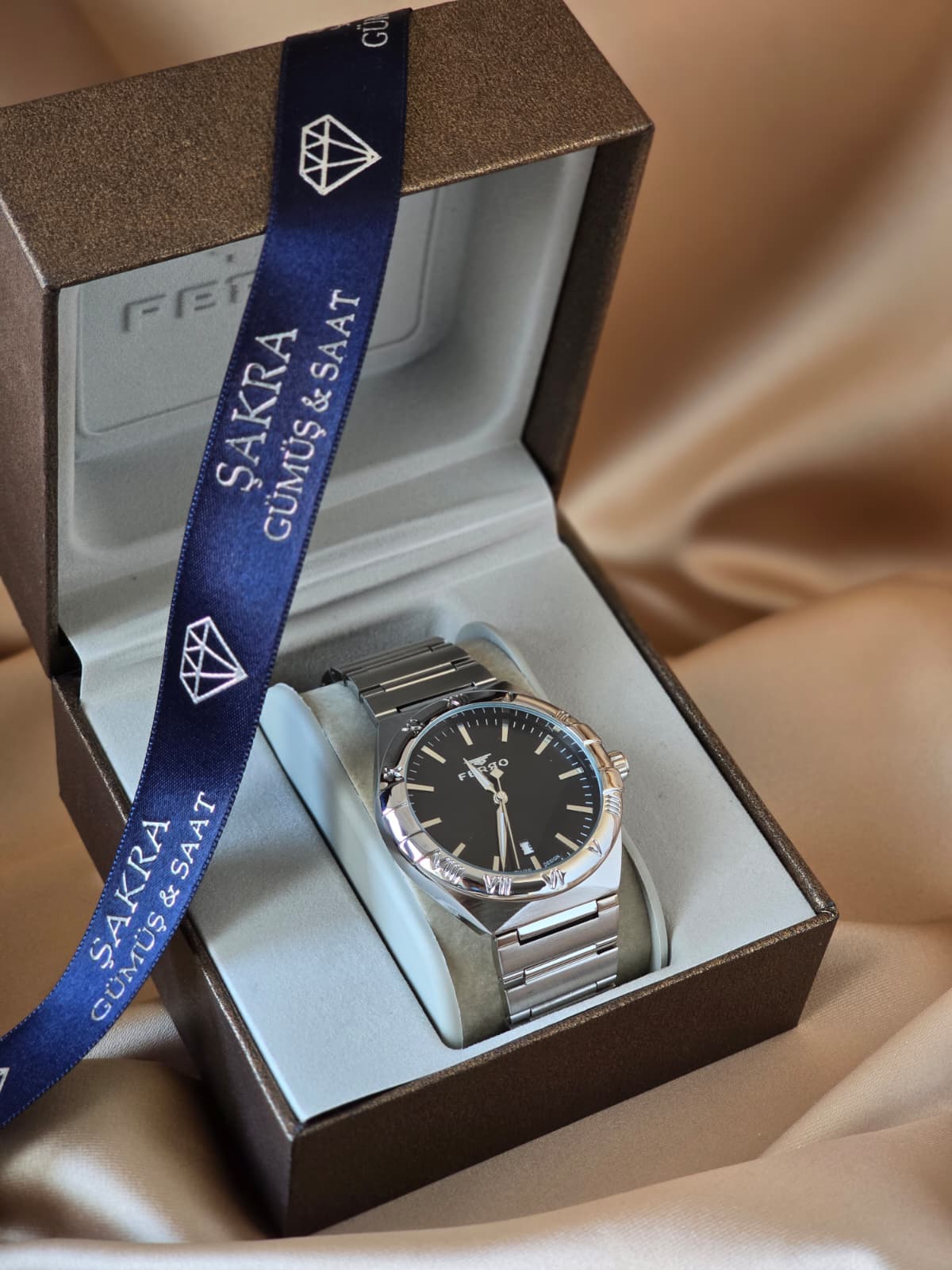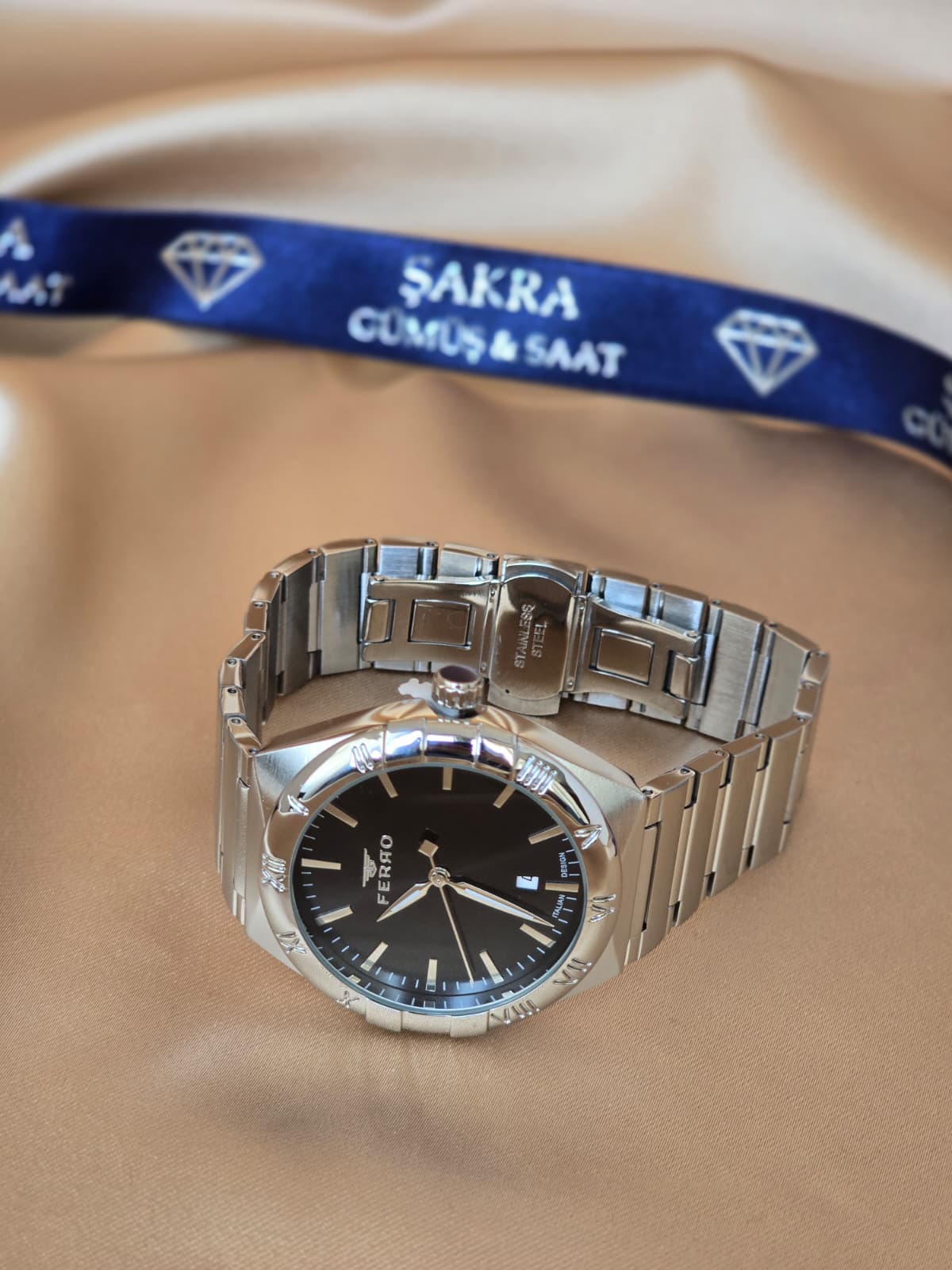 FERRO Classic Black Date erkek kol saati, siyah kadranı ve çerçeve üzerindeki klasik detaylarıyla zamansız ve güçlü bir şıklık sunar. Net indeks çizgileri ve saat 3 konumundaki tarih göstergesi, kadrana sade ve dengeli bir görünüm kazandırır. Çelik kasa ve metal kordonu, dayanıklılık ve konforu bir arada sunarken; klasik tasarımı sayesinde günlük kullanımdan ofis stiline kadar her ortamda rahatlıkla tercih edilebilir. Abartıdan uzak, karakterli ve net bir duruş arayan erkekler için ideal bir modeldir.