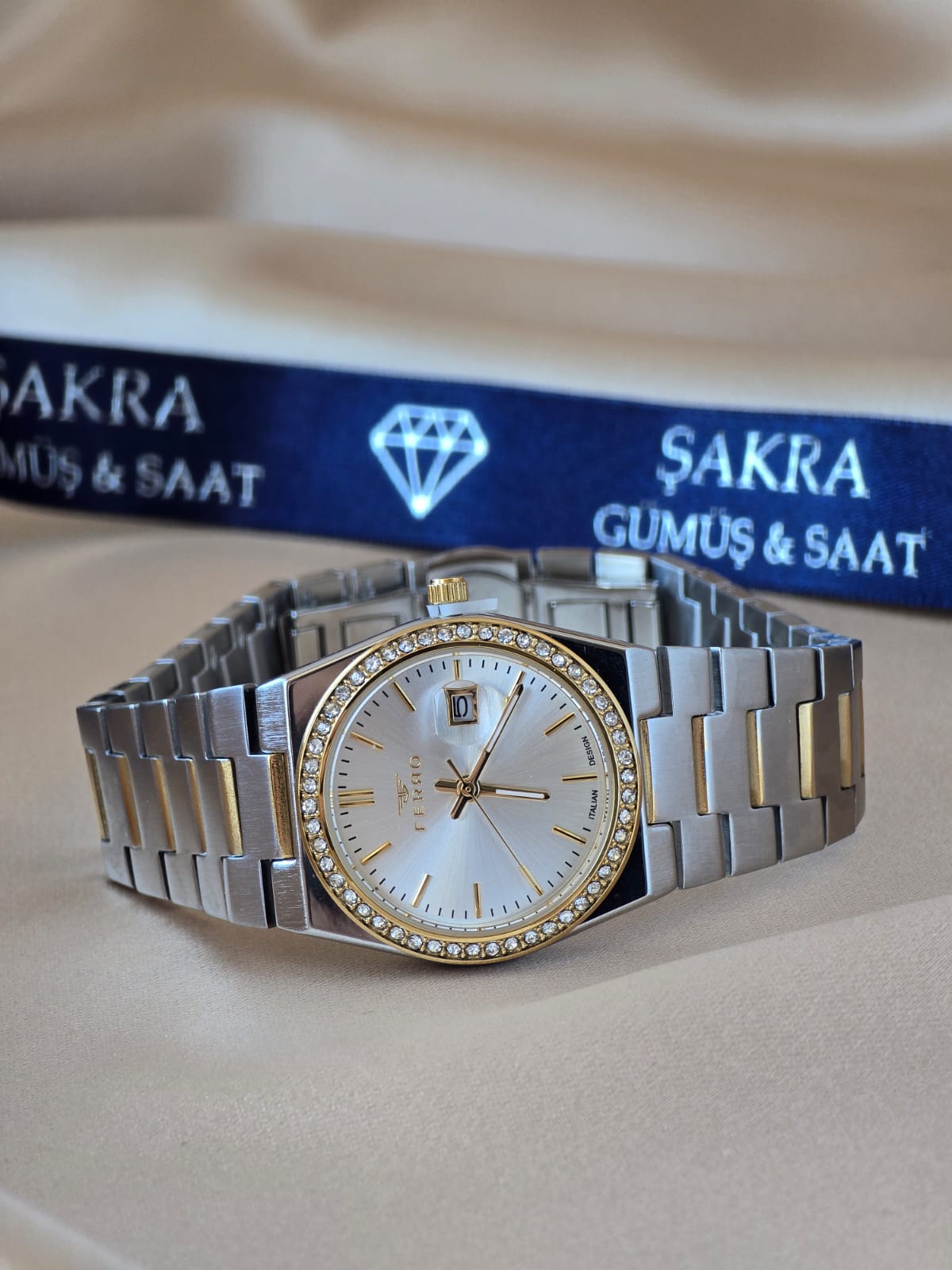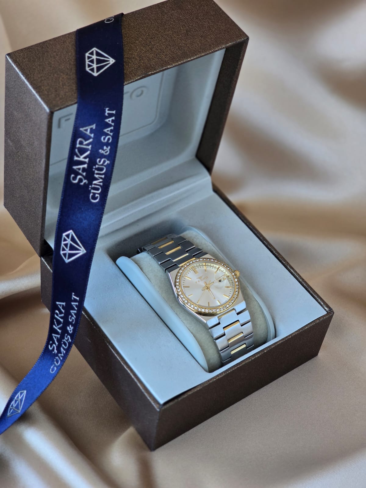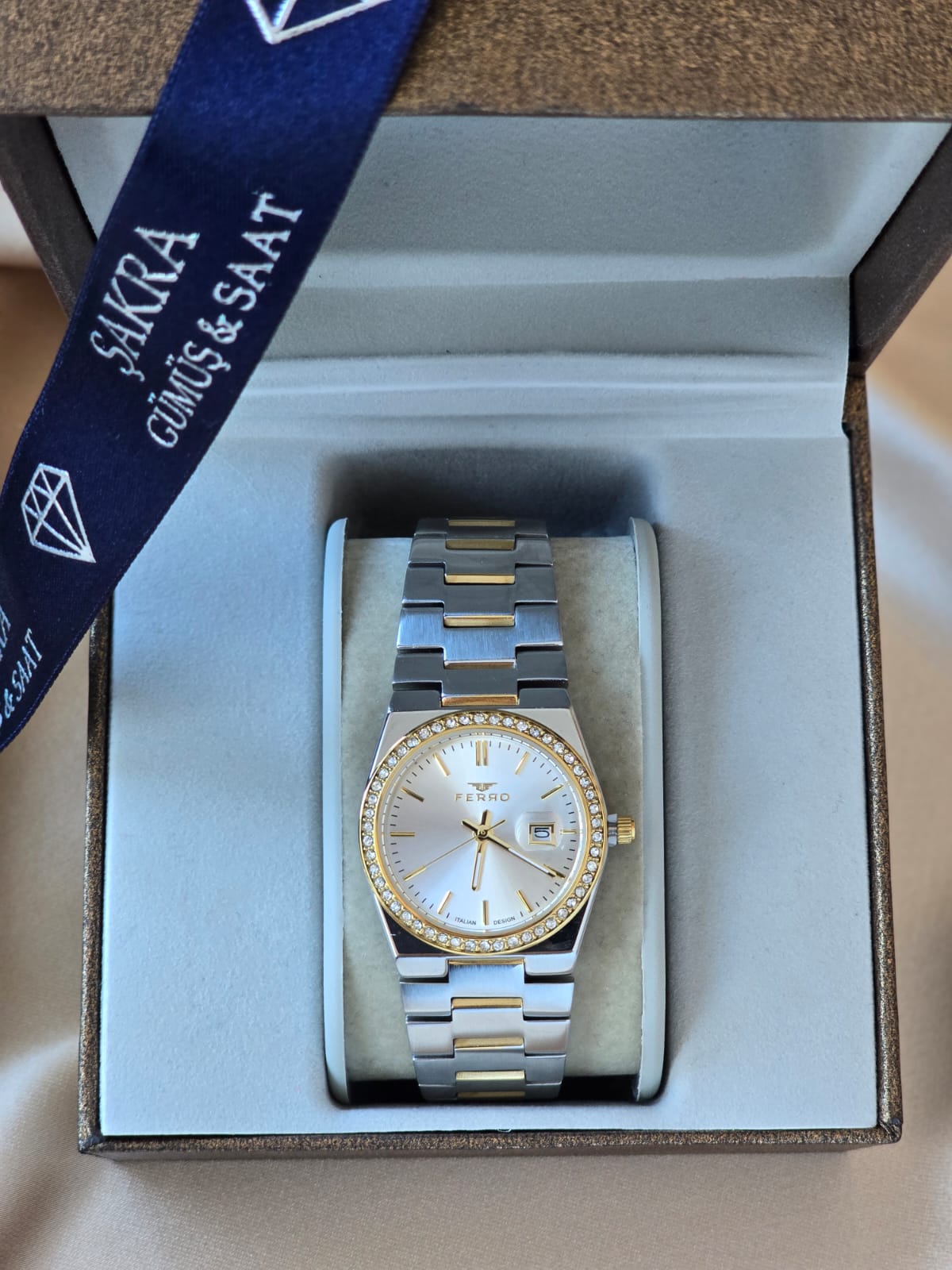 FERRO Classic Date Gold bayan kol saati, zamansız şıklığı modern detaylarla buluşturan zarif bir tasarıma sahiptir. Altın renk taşlarla çevrelenmiş yuvarlak kasası, saate sofistike bir ışıltı kazandırırken; sade beyaz kadranı ve altın indeksleri net ve estetik bir görünüm sunar. Takvim göstergesi sayesinde hem şık hem de fonksiyonel bir kullanım sağlar. Çift renkli metal kordonu ile günlük kombinlerden özel davetlere kadar her stile kolayca uyum sağlar.