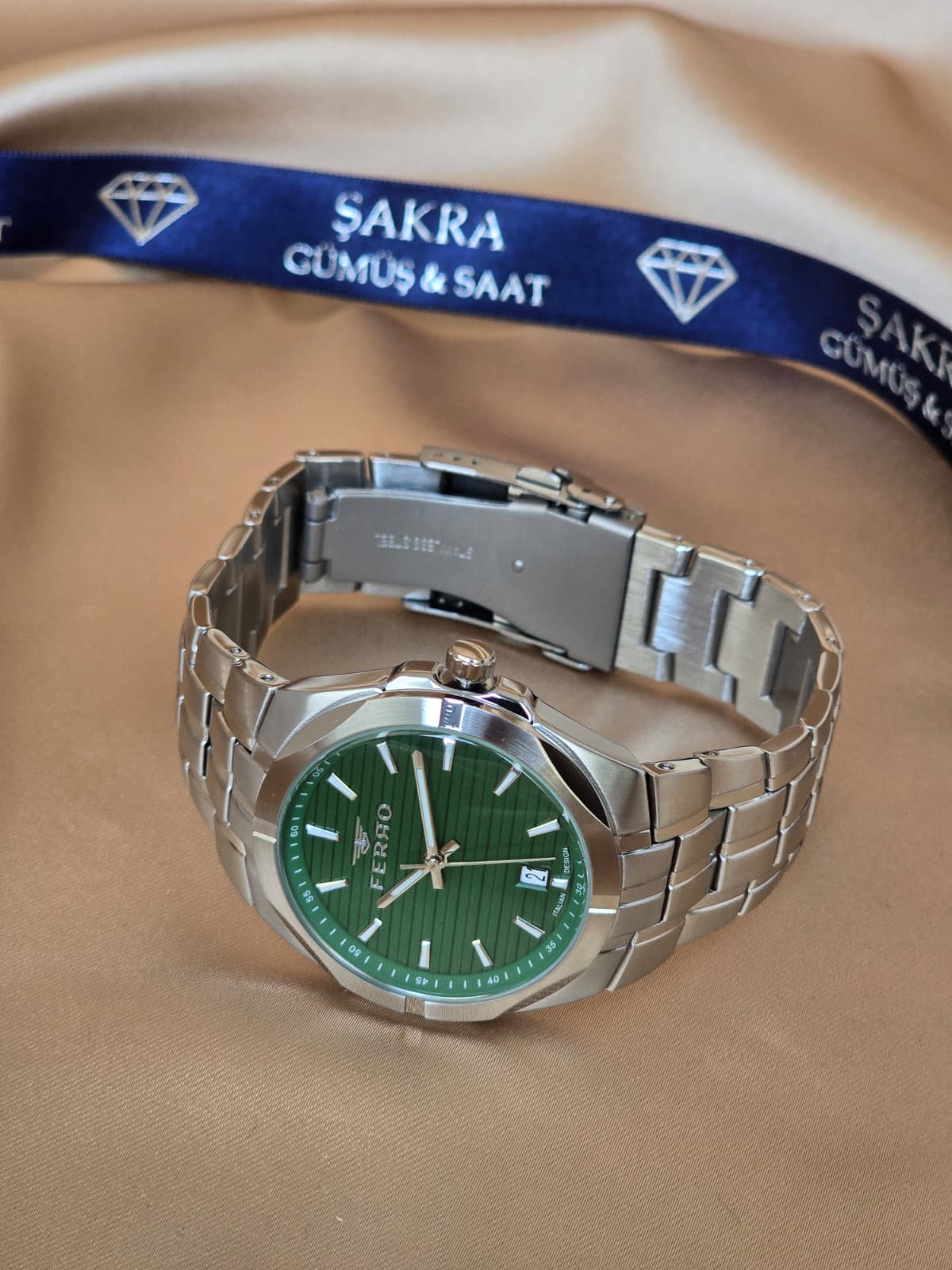 FERRO Classic Green Date erkek kol saati, yeşil kadranının çizgili dokusu ve sade tasarımıyla modern bir zarafet sunar. Minimal indeksler ve saat 3 konumundaki tarih penceresi, kadrana net ve dengeli bir görünüm kazandırır. Çelik kasa ve metal kordonu, dayanıklılığı konforla birleştirirken; yeşil rengin asil tonu saate karakterli ve özgün bir duruş katar. Günlük kullanımda, ofis stilinde ve özel kombinlerde rahatlıkla tercih edilebilecek zamansız bir modeldir.