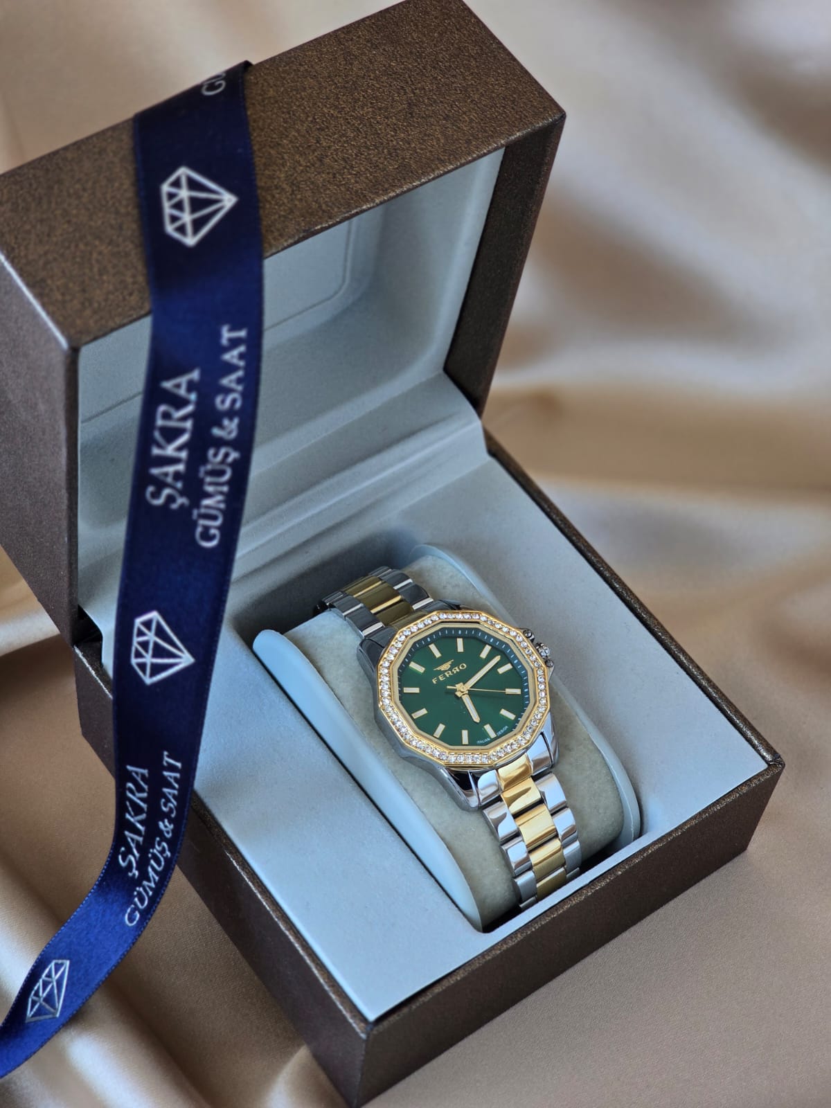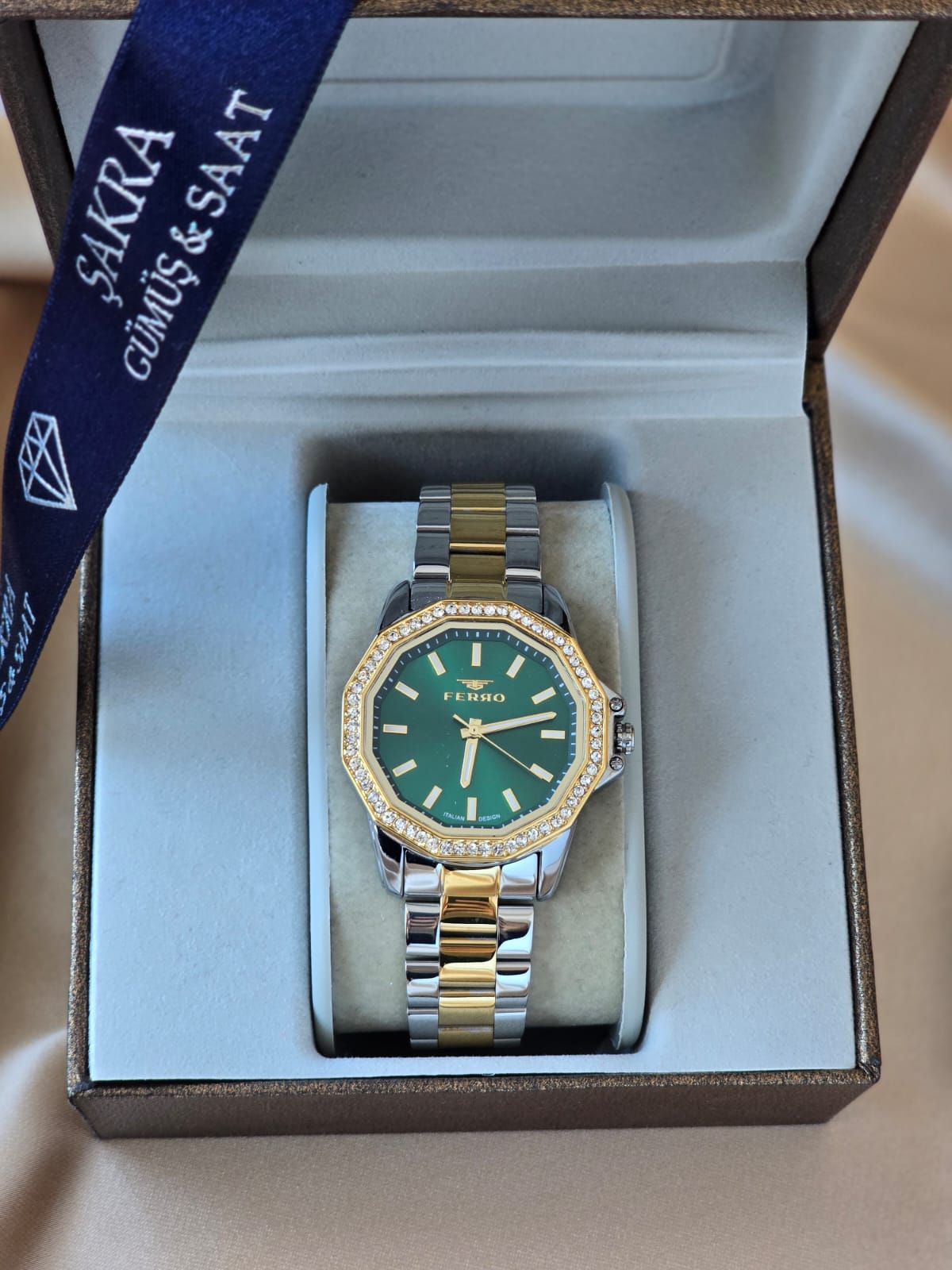 FERRO Emerald bayan kol saati, yeşil kadranın asil duruşunu altın taşlı çerçeveyle birleştirerek güçlü ve şık bir tasarım sunar. Çokgen (sekizgen) kasa formu modern bir görünüm kazandırırken, altın detaylarla zenginleştirilmiş iki renkli metal kordon saate prestijli bir karakter katar. Günlük şıklıkta fark yaratmak isteyen kadınlar için olduğu kadar, özel gün kombinlerinde de iddialı bir tamamlayıcıdır.