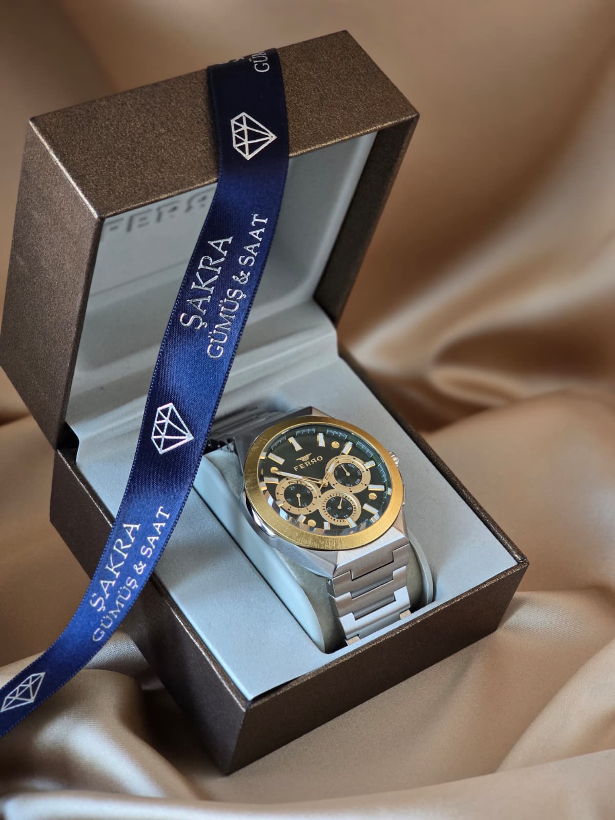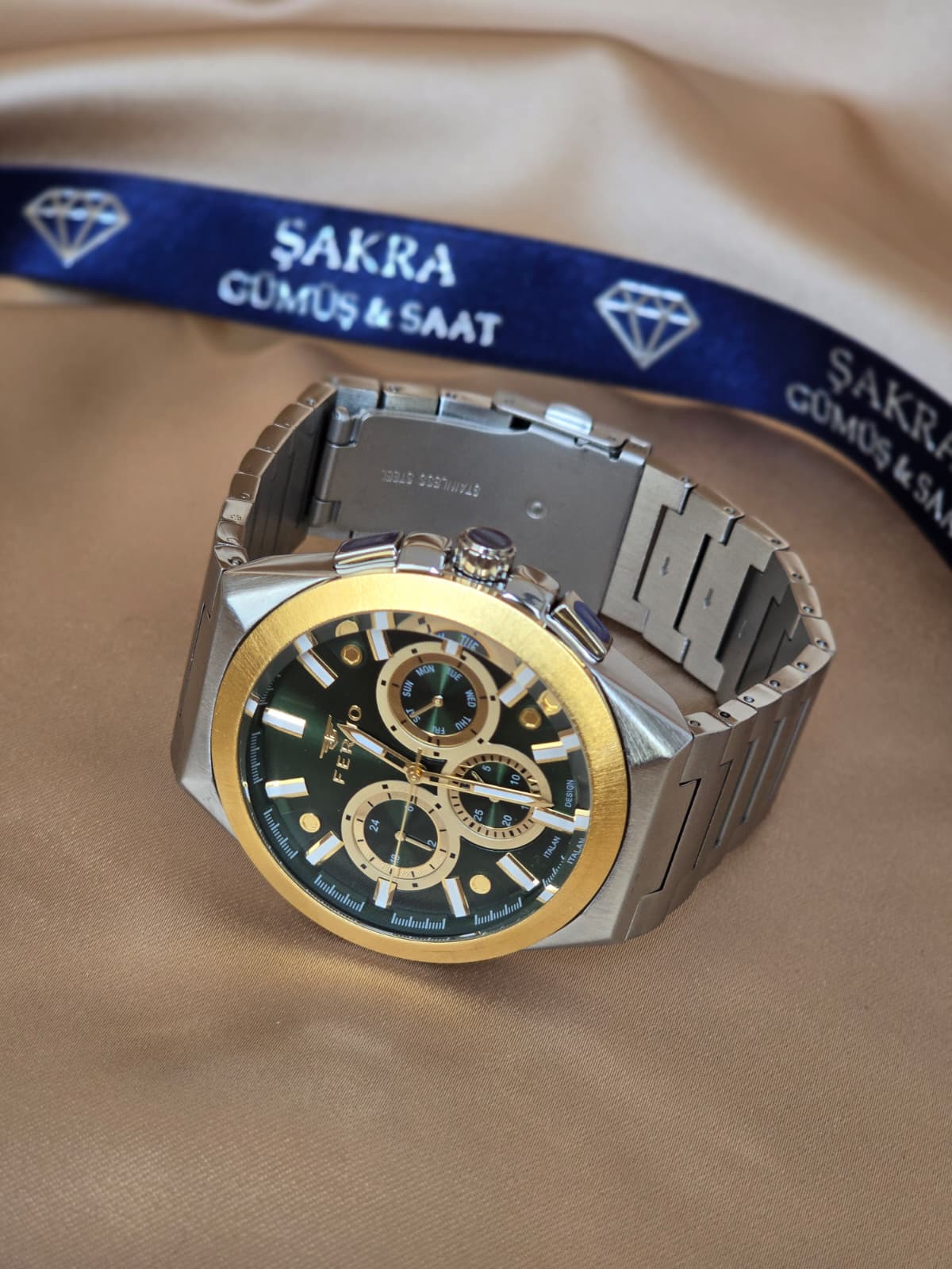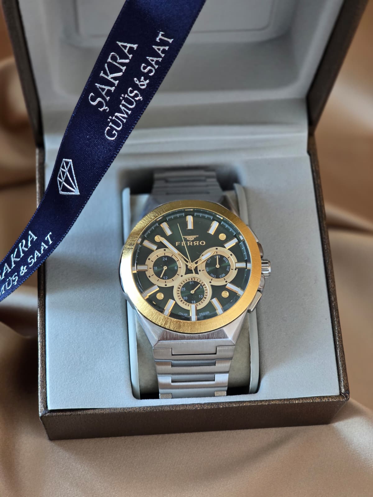 FERRO Gold Bezel Green Dial erkek kol saati, yeşil kadranın derinliği ile altın bezel detaylarının güçlü duruşunu bir araya getirir. Çok fonksiyonlu kadran yapısı; gün, tarih ve 24 saat göstergeleriyle hem şık hem işlevsel bir kullanım sunar. Paslanmaz çelik kasa ve metal kordonu, saatin maskülen karakterini tamamlayarak günlük ve klasik kombinlere uyum sağlar. Zamansız bir stil arayanlar için güçlü bir tercihtir.