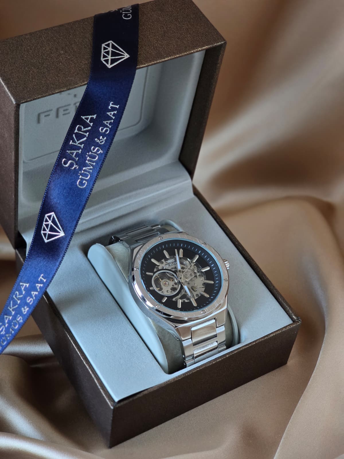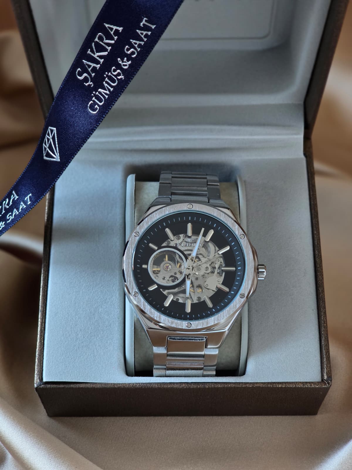 FERRO Skeleton Automatic erkek kol saati, mekanizmasını açıkta sergileyen iskelet kadranı ile saat tutkunlarına gerçek bir mühendislik deneyimi sunar. Otomatik mekanizmanın her hareketi, güçlü çelik kasa ve metal bilezikle birleşerek zamansız bir şıklık oluşturur. Detaylarda ustalık, tasarımda cesaret arayan erkekler için tasarlanmıştır. Gösterişli ama abartısız; güçlü ama zarif.