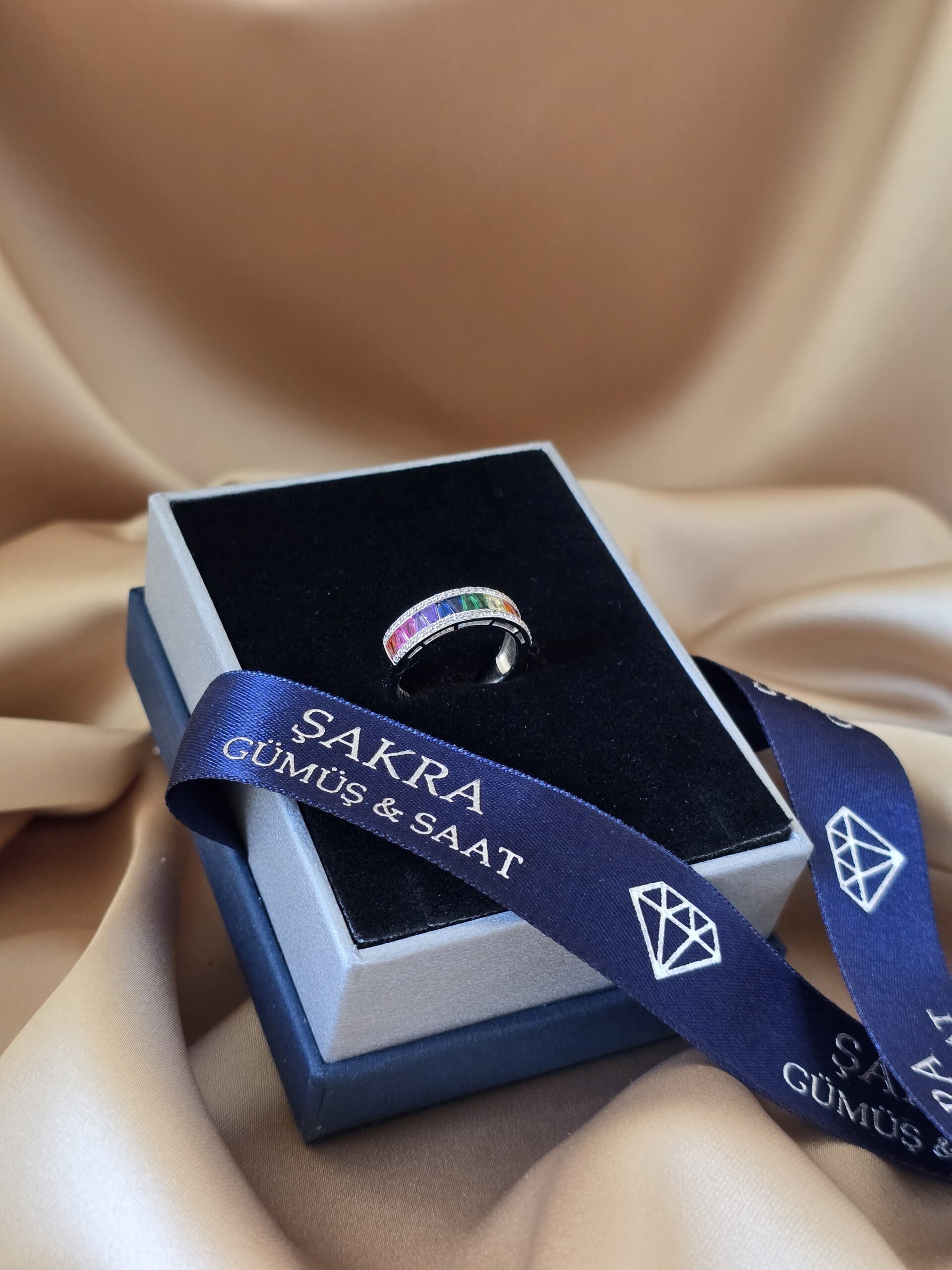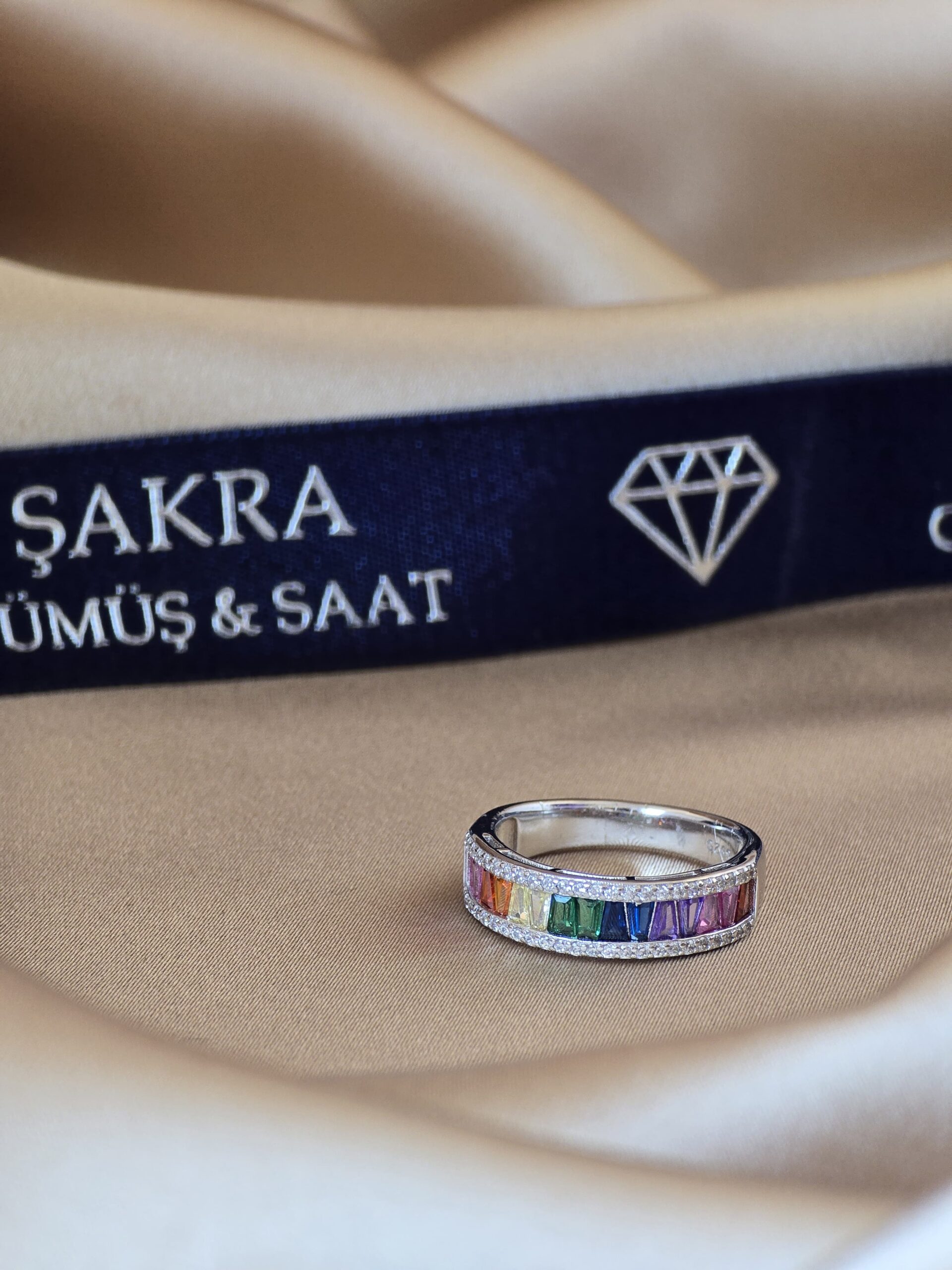 Renklerin enerjisini zarafetle buluşturan gökkuşağı taşlı bayan gümüş yüzük, modern tasarımıyla dikkat çekiyor.