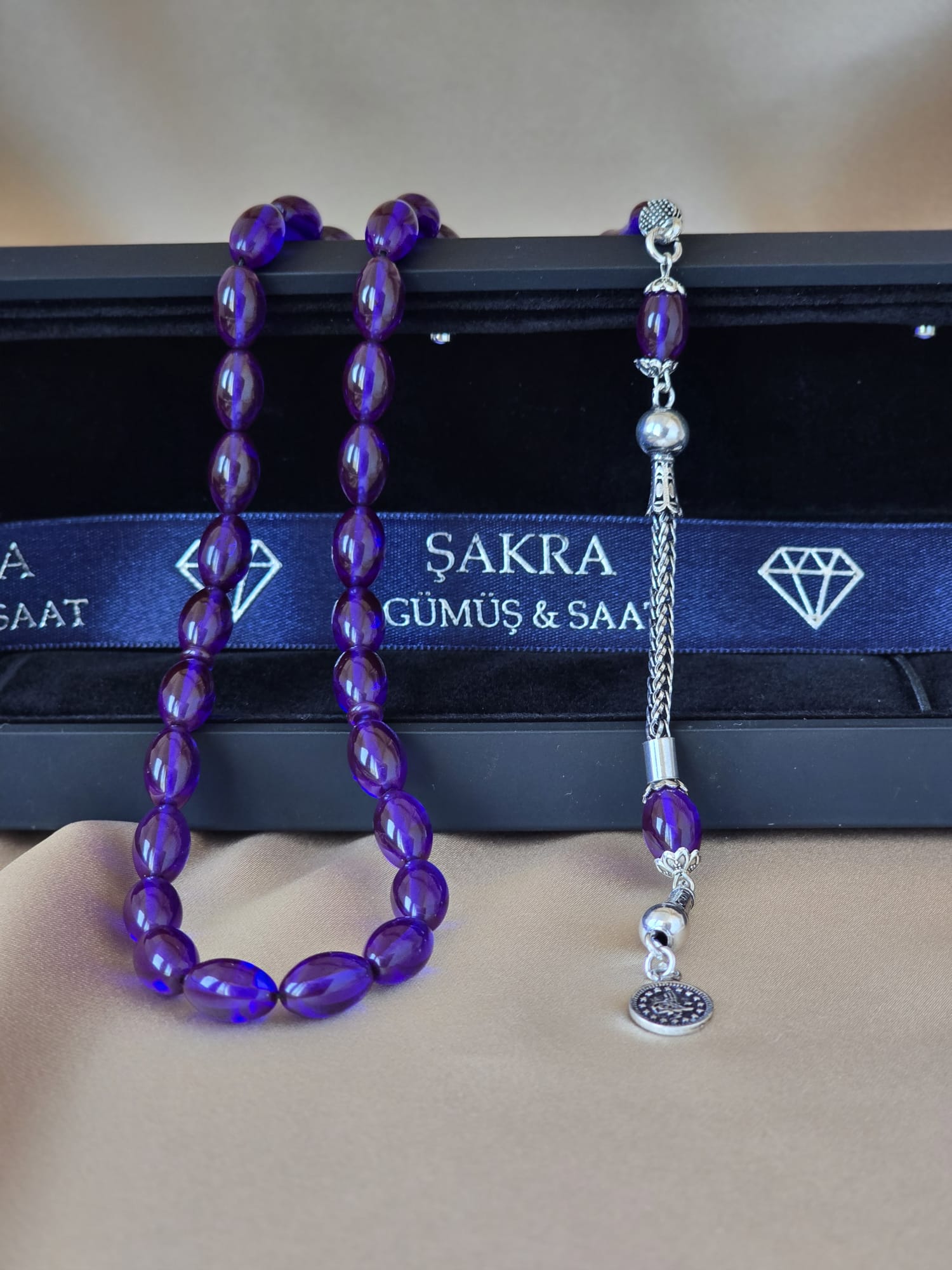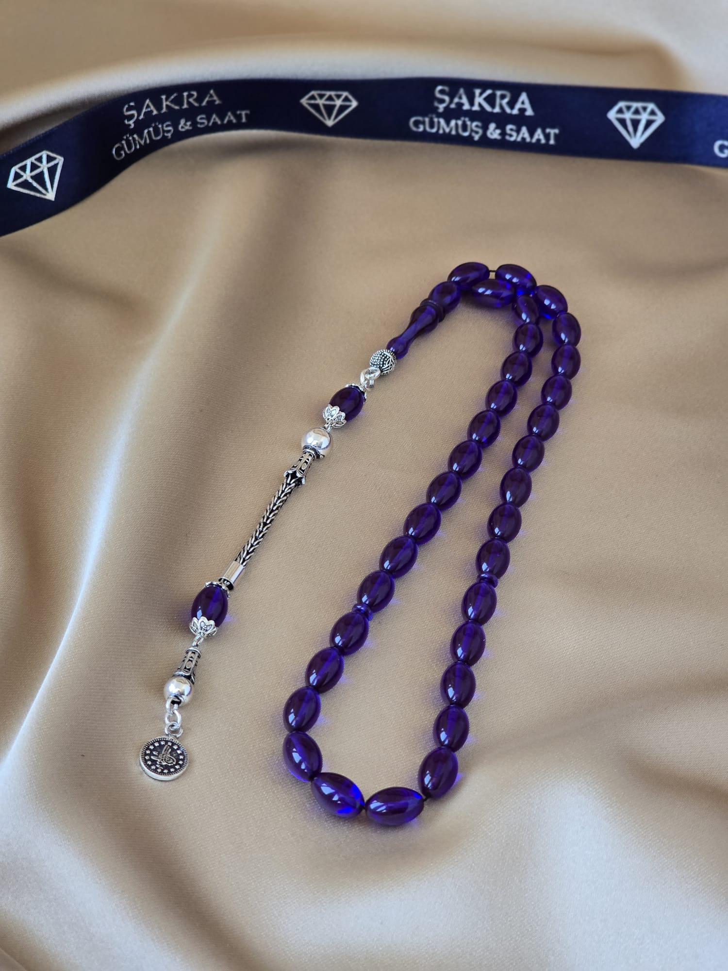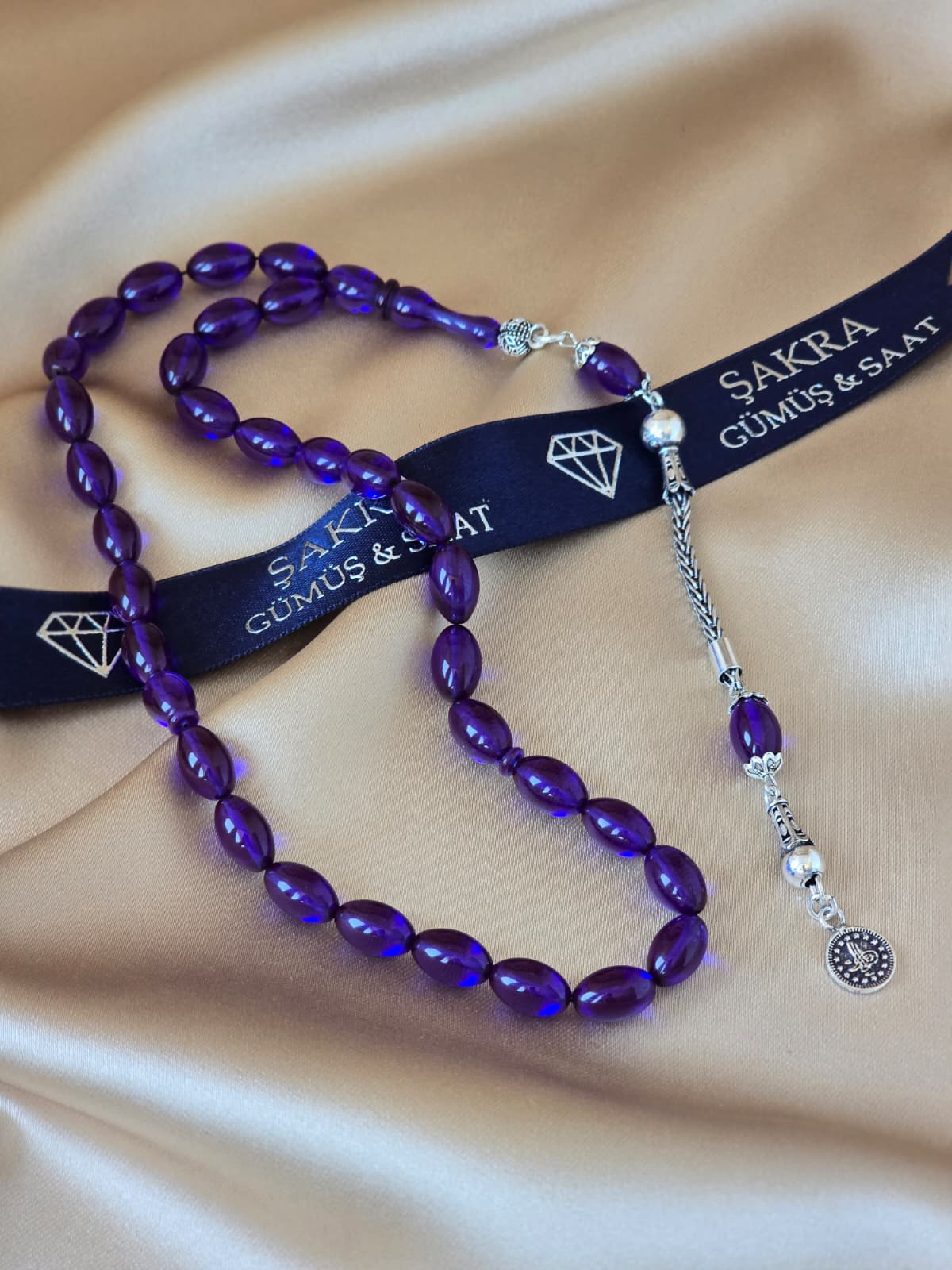 Derin ve canlı mor tonlara sahip ateş kehribar taneleriyle hazırlanan bu tesbih, şıklığı ve zarafeti bir arada sunar. Oval kesim taneler ışıkla birlikte parlaklık ve renk derinliği oluşturur. El işçiliğiyle tasarlanmış gümüş püskül, tesbihe güçlü ve asil bir karakter kazandırır. Günlük kullanımda rahatlık sağlayan yapısı ve estetik duruşuyla hem koleksiyonluk hem de özel bir hediye alternatifi olarak öne çıkar.
