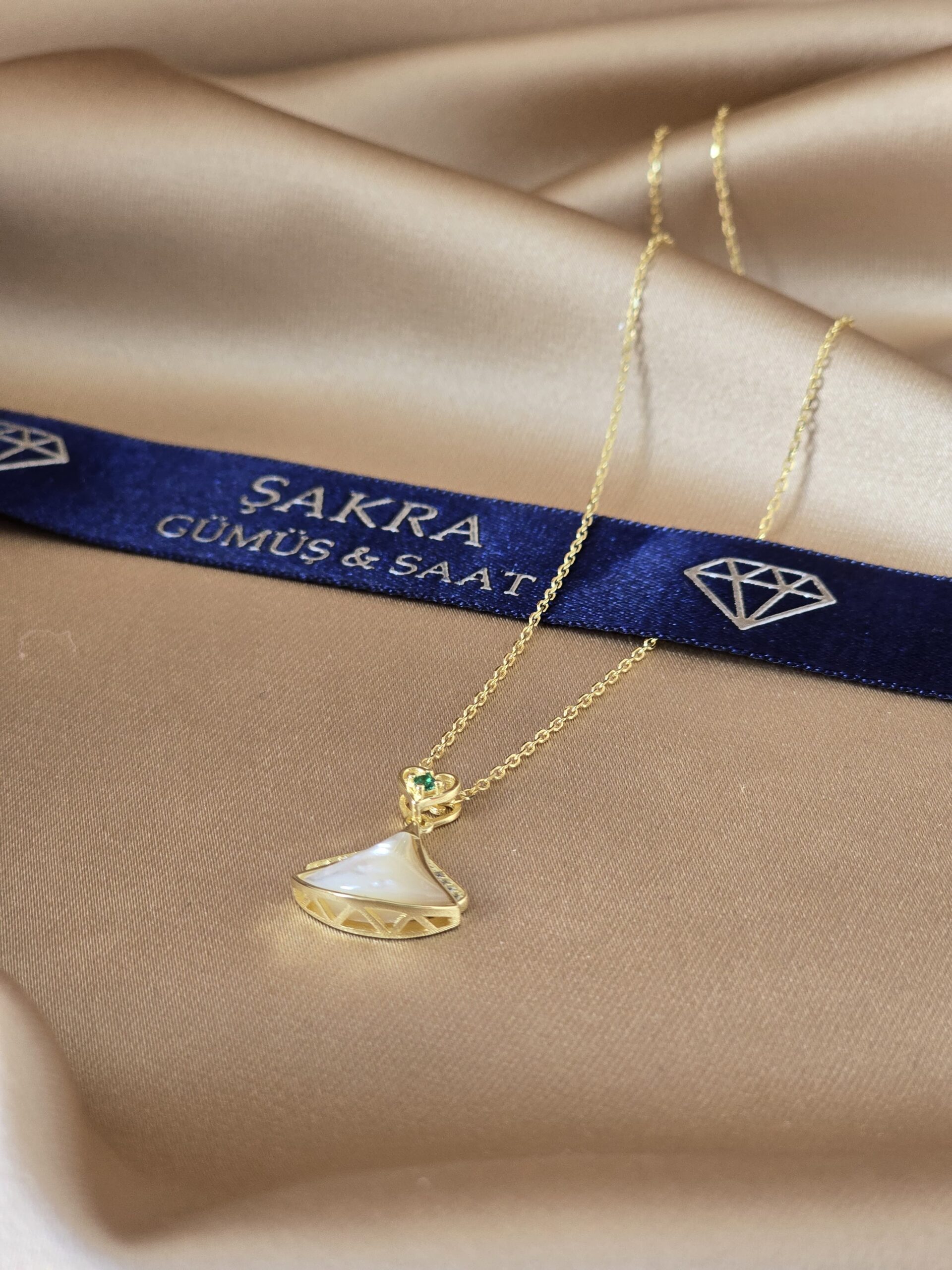Model: Sedef görünümlü üçgen kolye – üstte yeşil taşlı detay