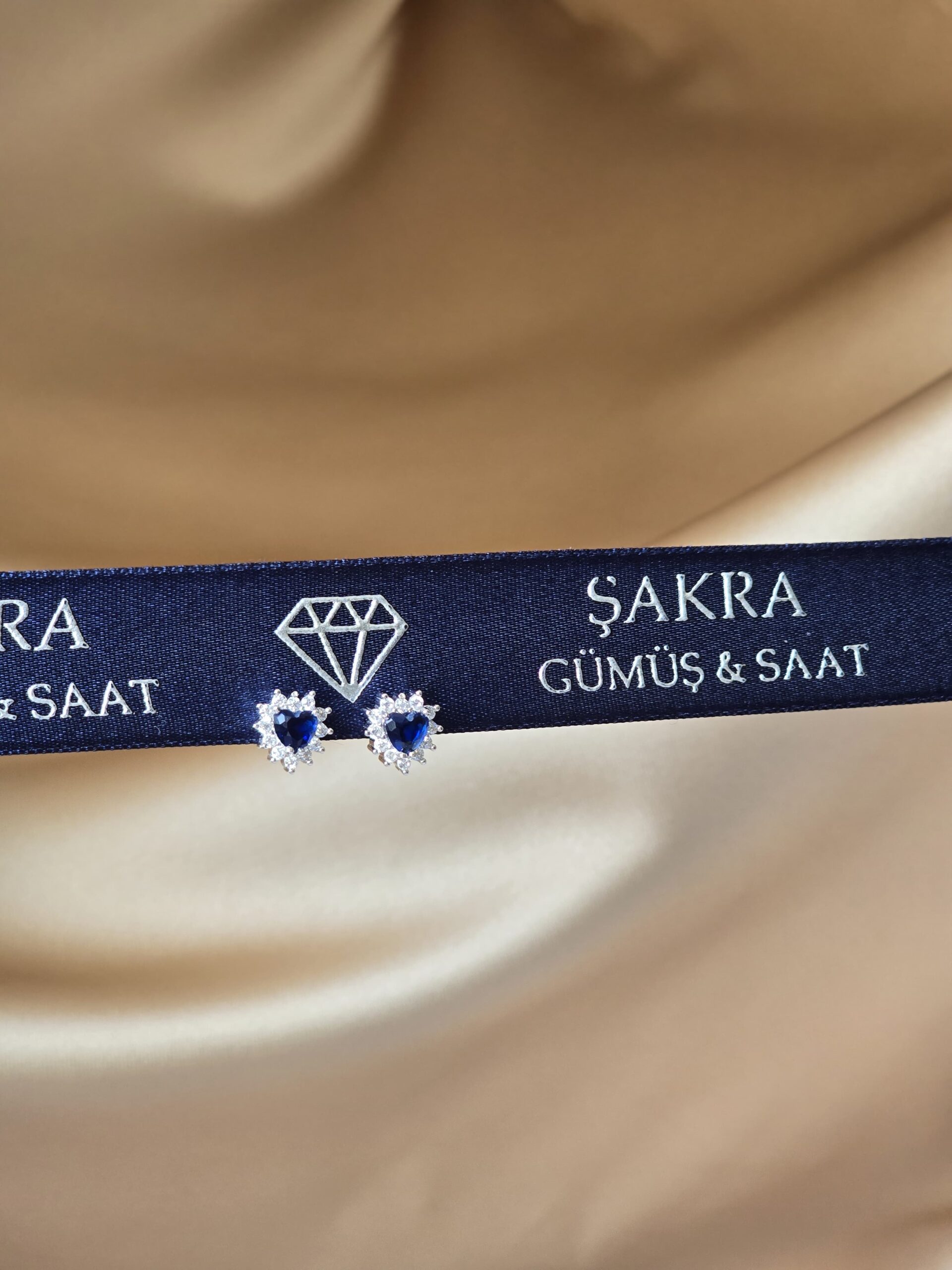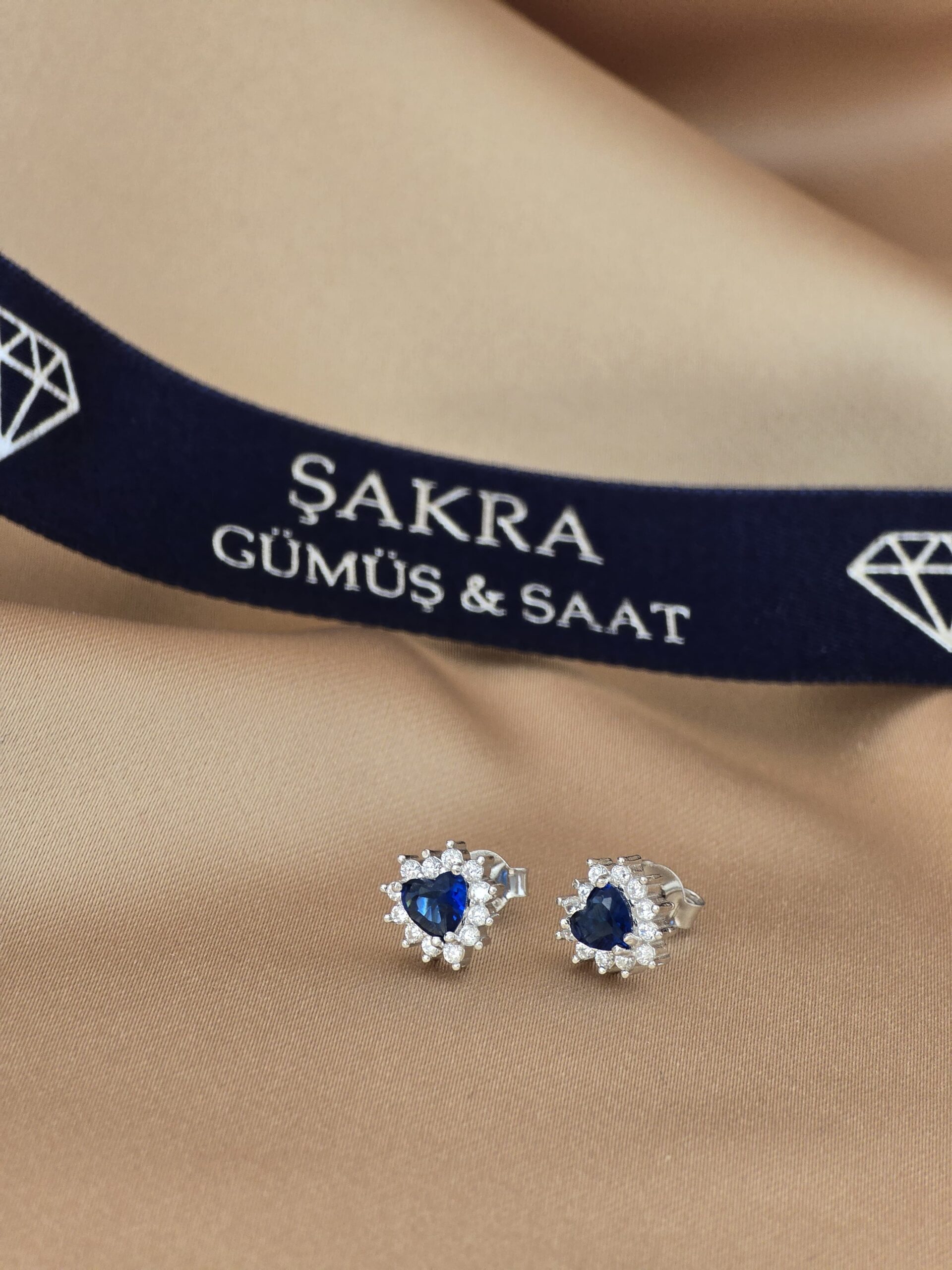 Şakra Gümüş & Saat’in romantik ve zarif çizgisini yansıtan lacivert kalp taşlı taç form küpe modeli, hem anlamı hem de göz alıcı şıklığıyla dikkat çeker.