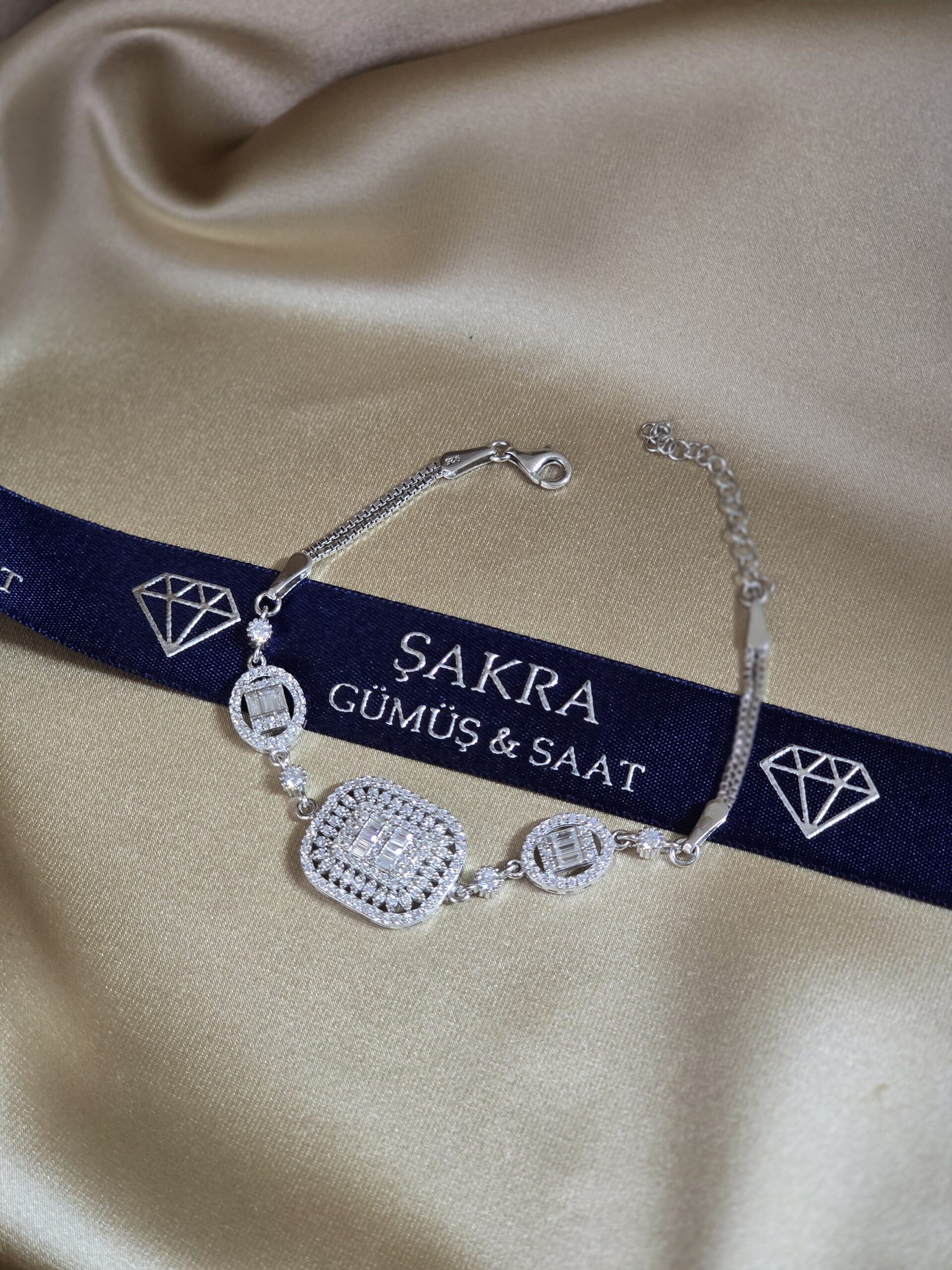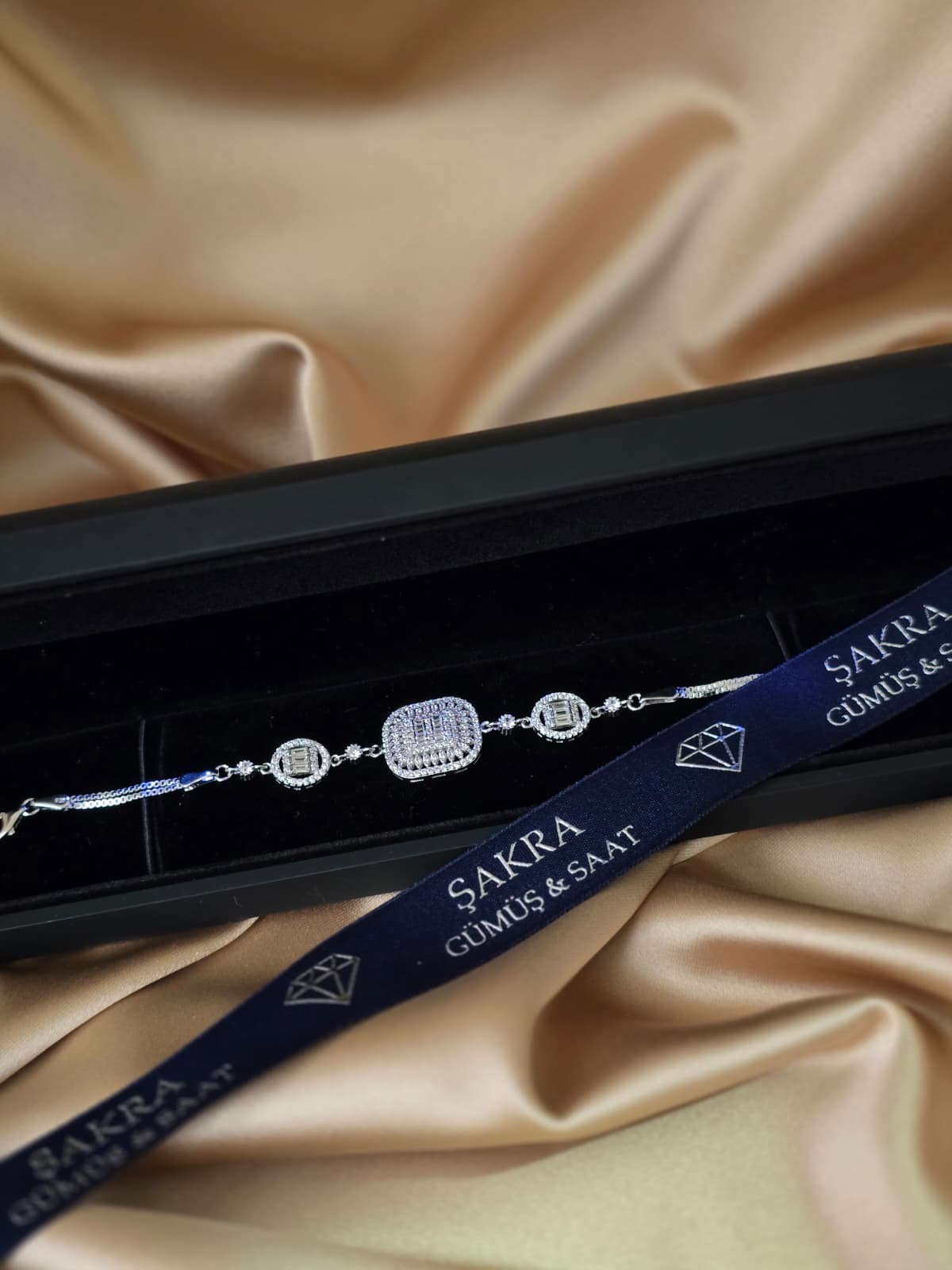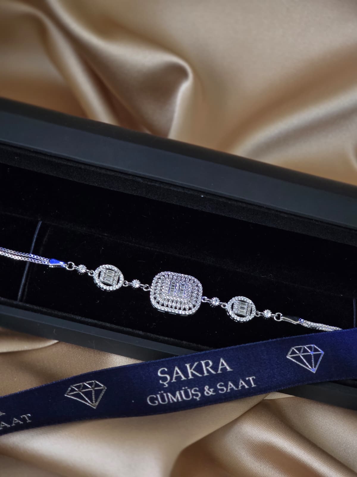 Şakra Gümüş & Saat’in özel koleksiyonuna ait baget taşlı üçlü motif gümüş bileklik, modern çizgileri zarafet ile buluşturan göz alıcı bir tasarımdır.