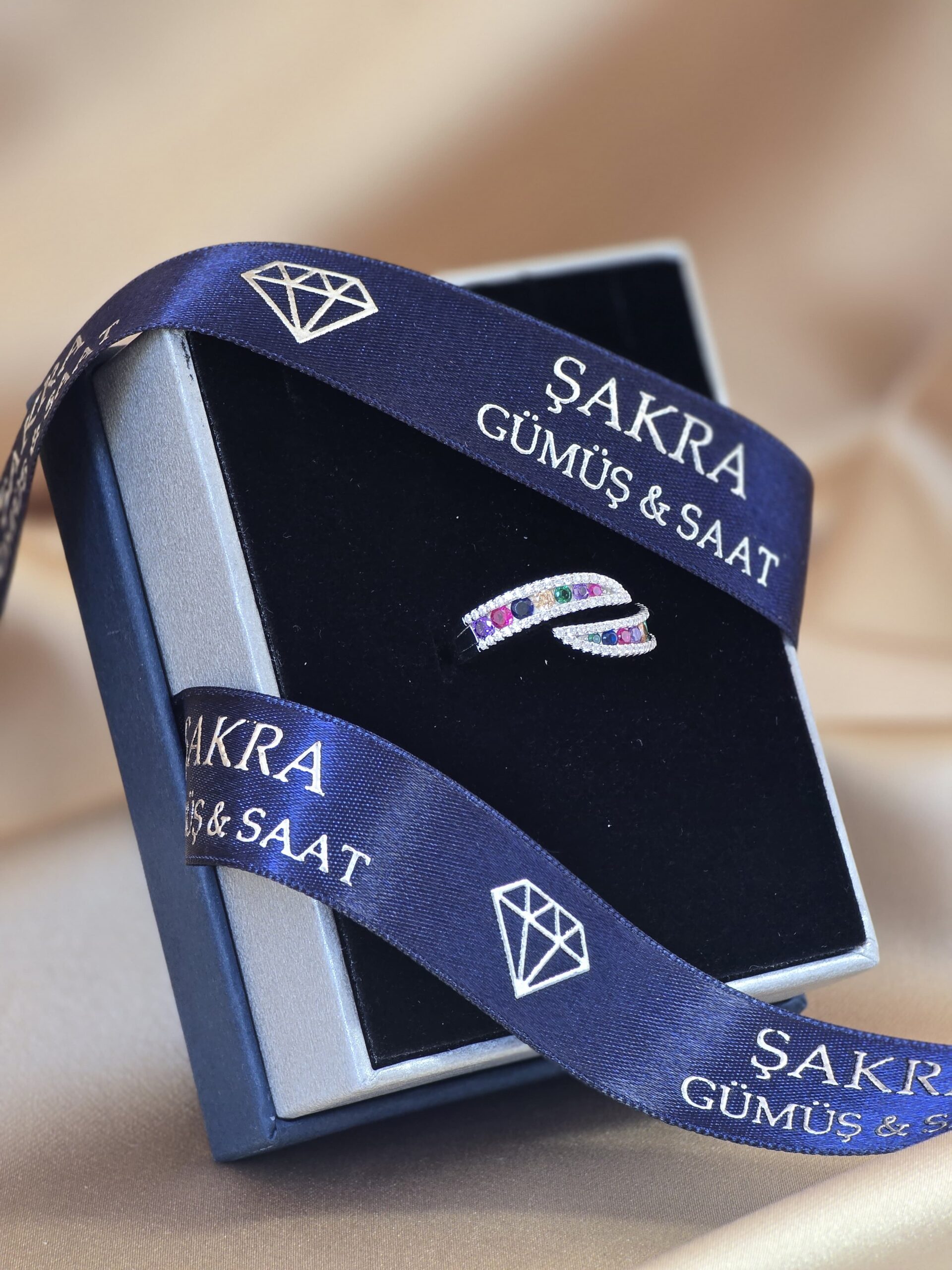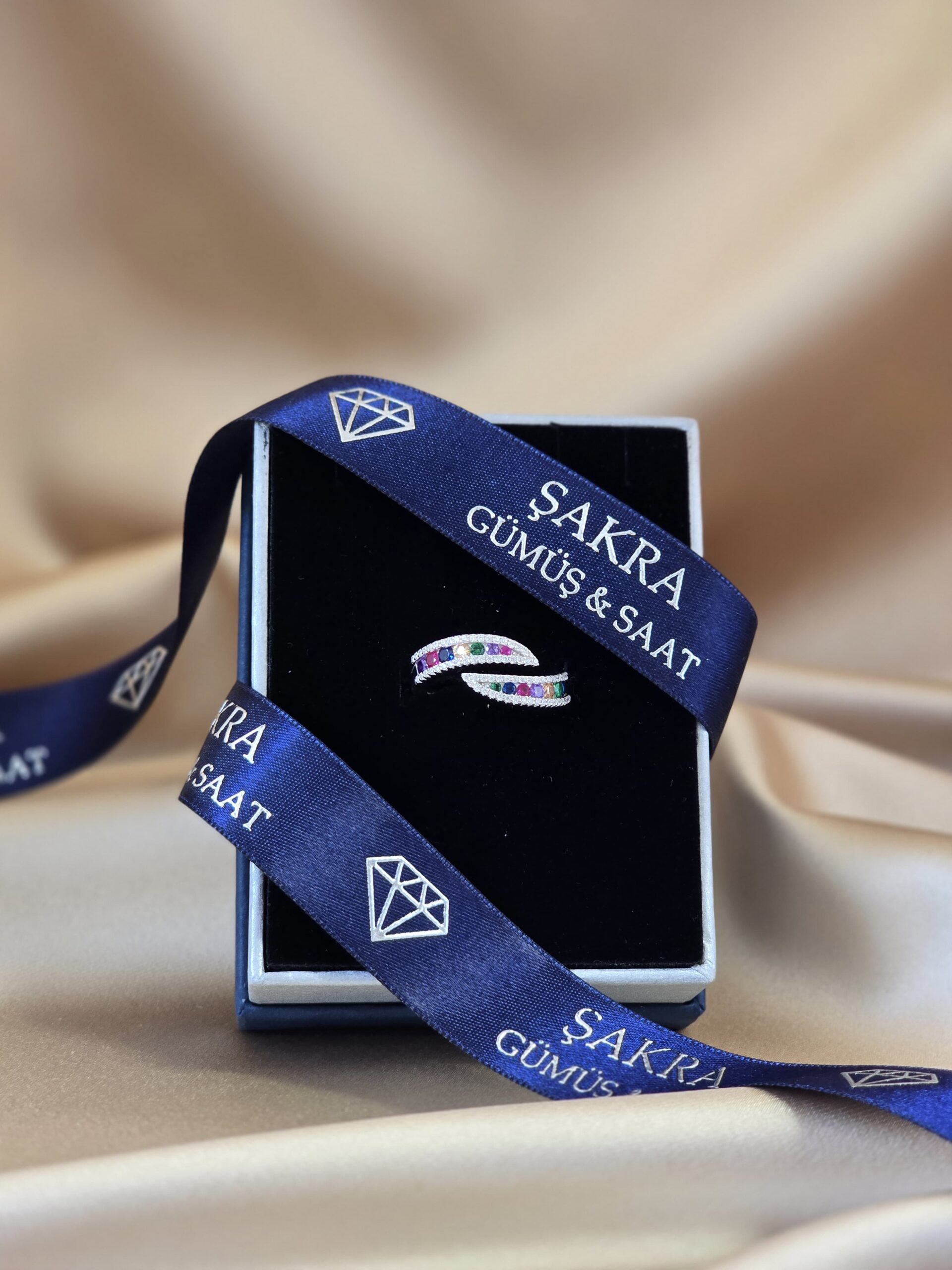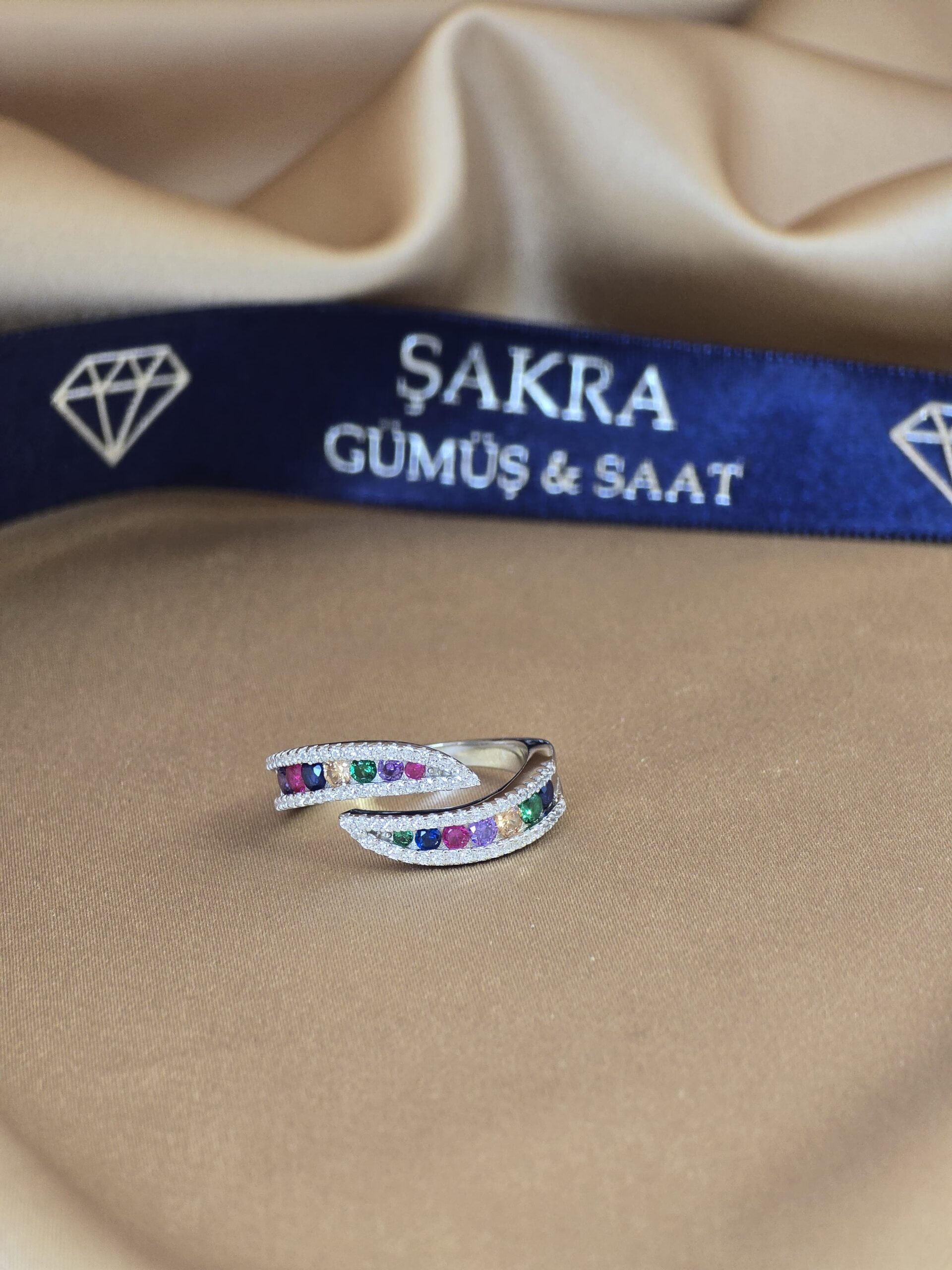 Şakra Gümüş & Saat’in özel koleksiyonunda yer alan bu renkli taşlı sarmal yüzük, şıklığı ve enerjiyi bir araya getiriyor.