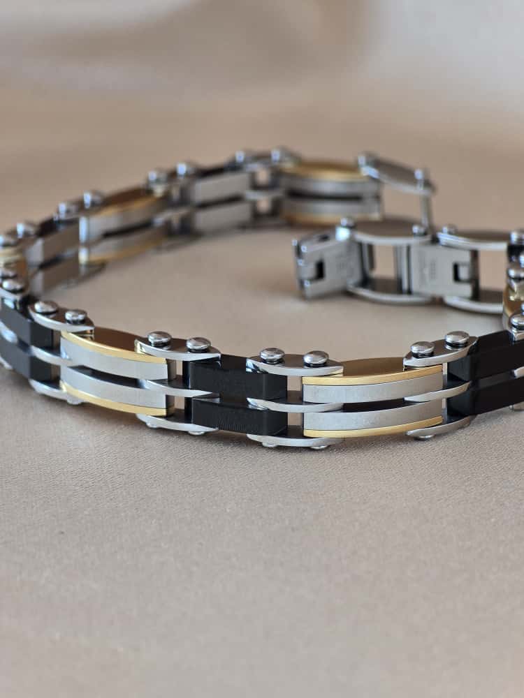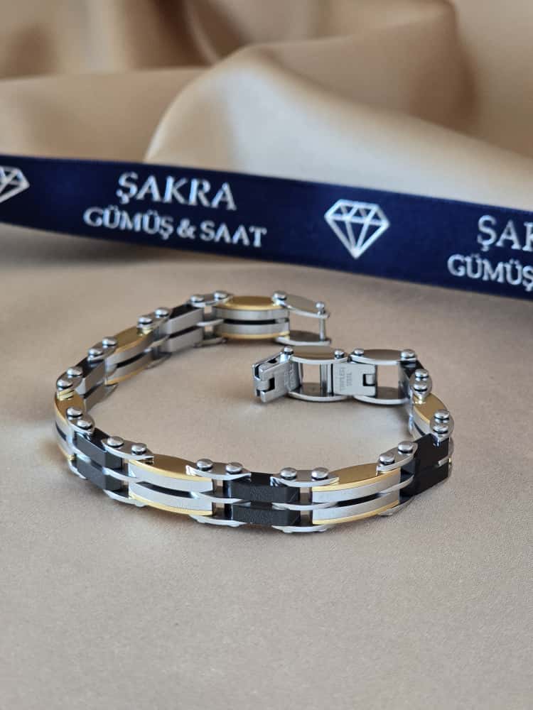 Gold ve siyah şerit detayların bir arada kullanıldığı çelik link yapısı, bu bilekliğe güçlü ve premium bir karakter kazandırır. Parlak çelik yüzeyler ile siyah ve gold tonların kontrastı, bilekte net ve dikkat çekici bir duruş oluşturur. Günlük kullanımda rahatlıkla tercih edilebilen bu model, klasik şıklığı modern çizgilerle buluşturan zamansız bir tasarım sunar.