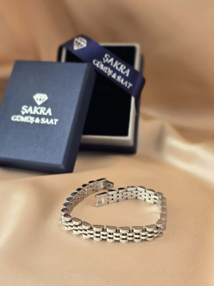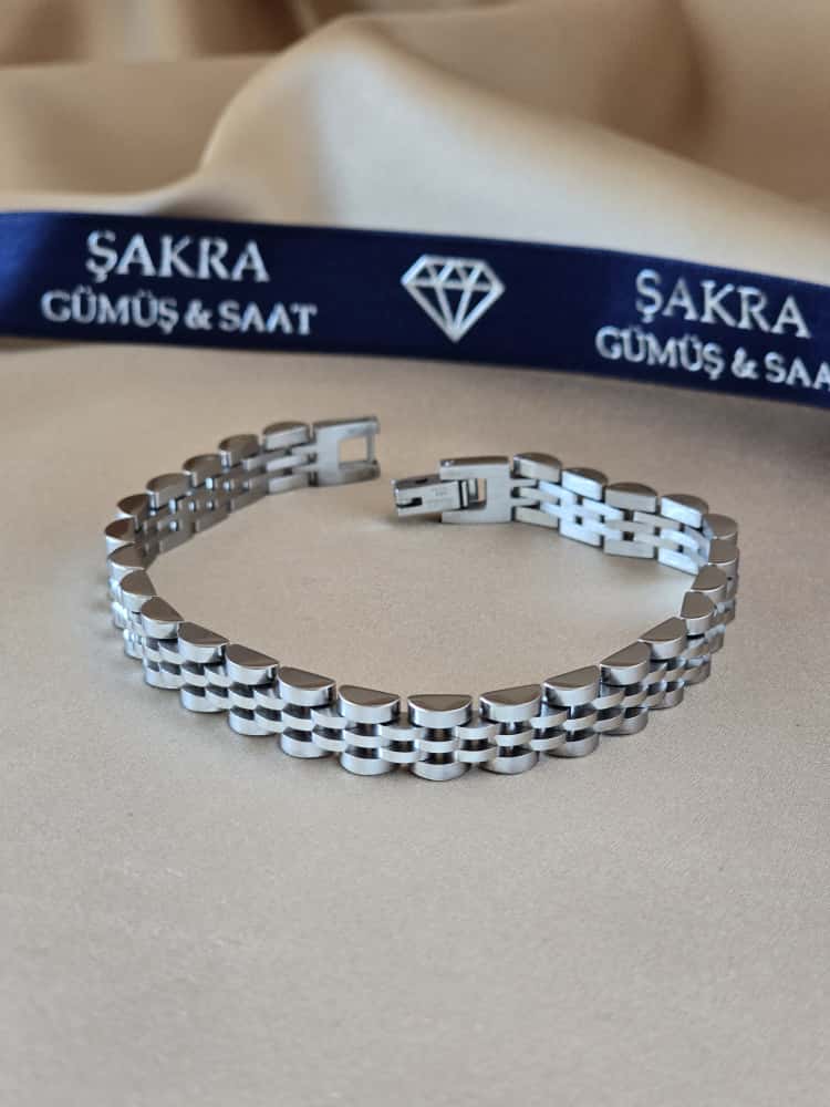 Klasik zincir formundan ilham alan çoklu link yapısıyla tasarlanan bu çelik bileklik, sade şıklığı ve güçlü duruşu bir arada sunar. Parlak metal yüzeyi ve simetrik bağlantıları sayesinde bilekte dolgun ve dengeli bir görünüm oluşturur. Zamansız tasarımıyla hem günlük kullanımda hem de özel kombinlerde rahatlıkla tercih edilebilecek bir modeldir.