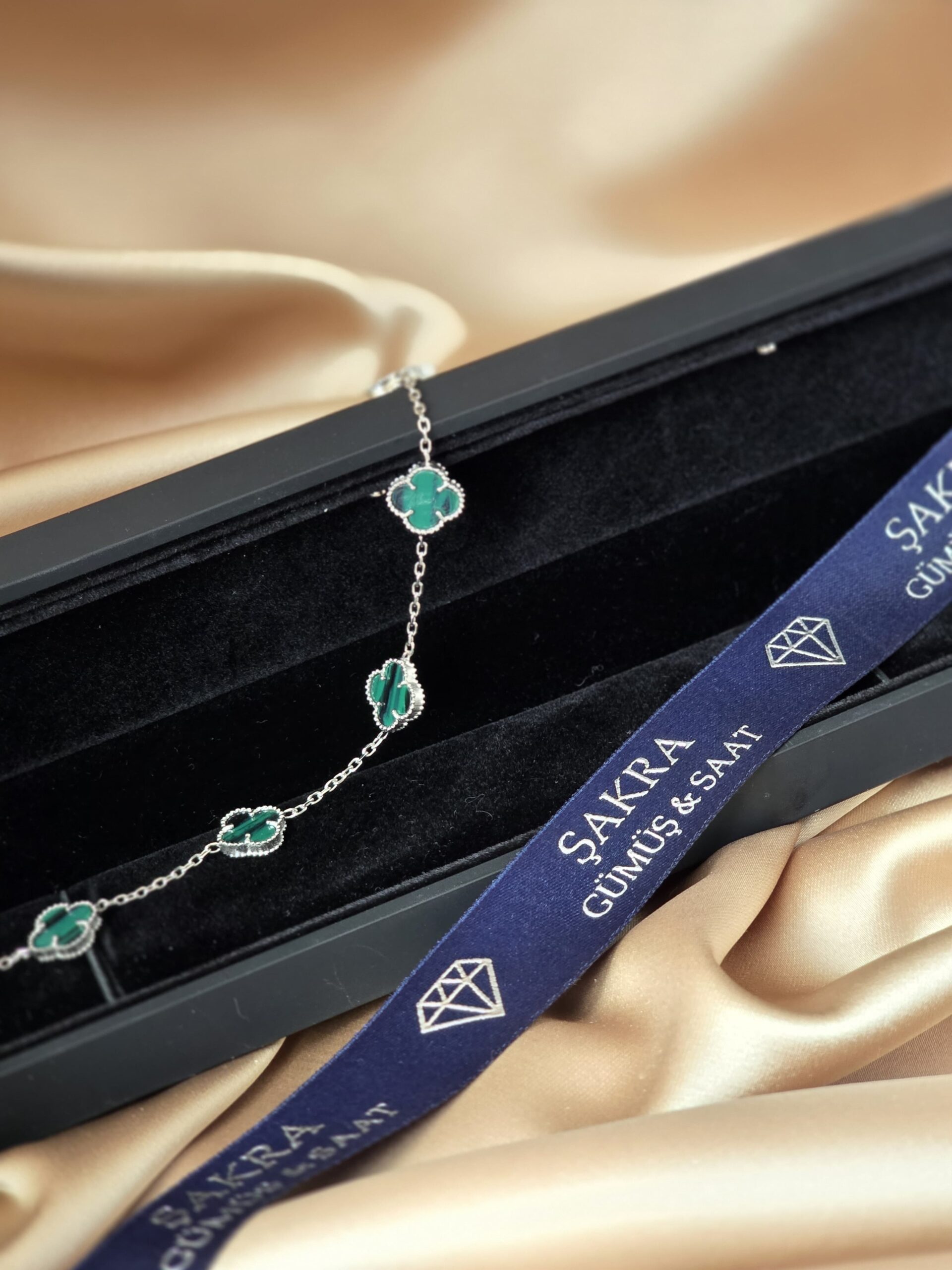 Şakra Gümüş & Saat’in şık ve modern koleksiyonundan yeşil taşlı çoklu yonca figürlü gümüş bileklik, zarif görünümü doğal tonlarla buluşturan özel bir tasarımdır.